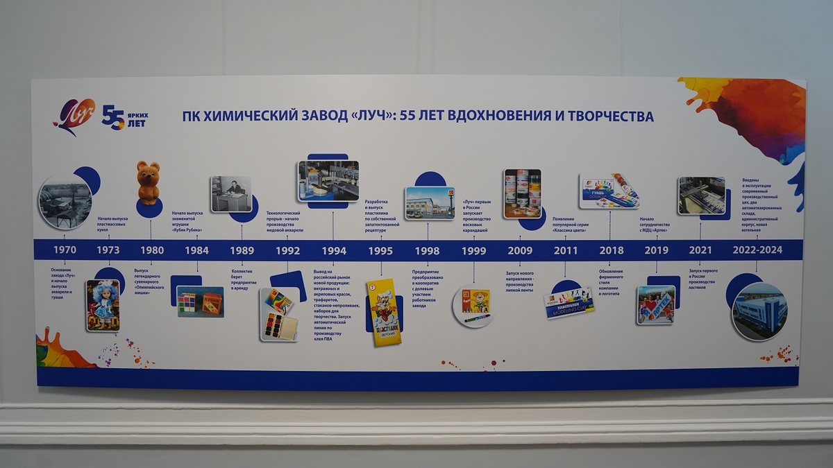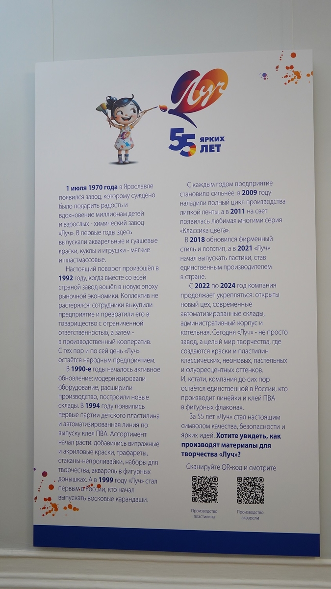 В музее истории города Ярославля имени В. Г. Извекова начала работу выставка «Луч: 55 ярких лет», посвящённая юбилею одного из самых известных предприятий региона — химического завода «Луч». Сегодня компания хорошо знакома миллионам семей как производитель красок, пластилина, восковых мелков и других товаров для детского творчества. Но за этими яркими упаковками — полувековая история труда, идей и человеческих судеб.