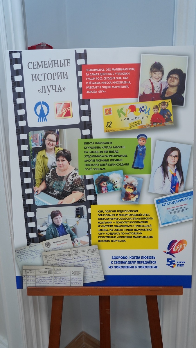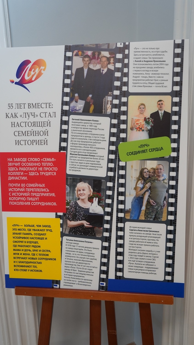 Особое внимание на выставке уделено людям, стоящим за производством. На предприятии работают настоящие трудовые династии — почти 80 семейных историй связаны с историей «Луча».