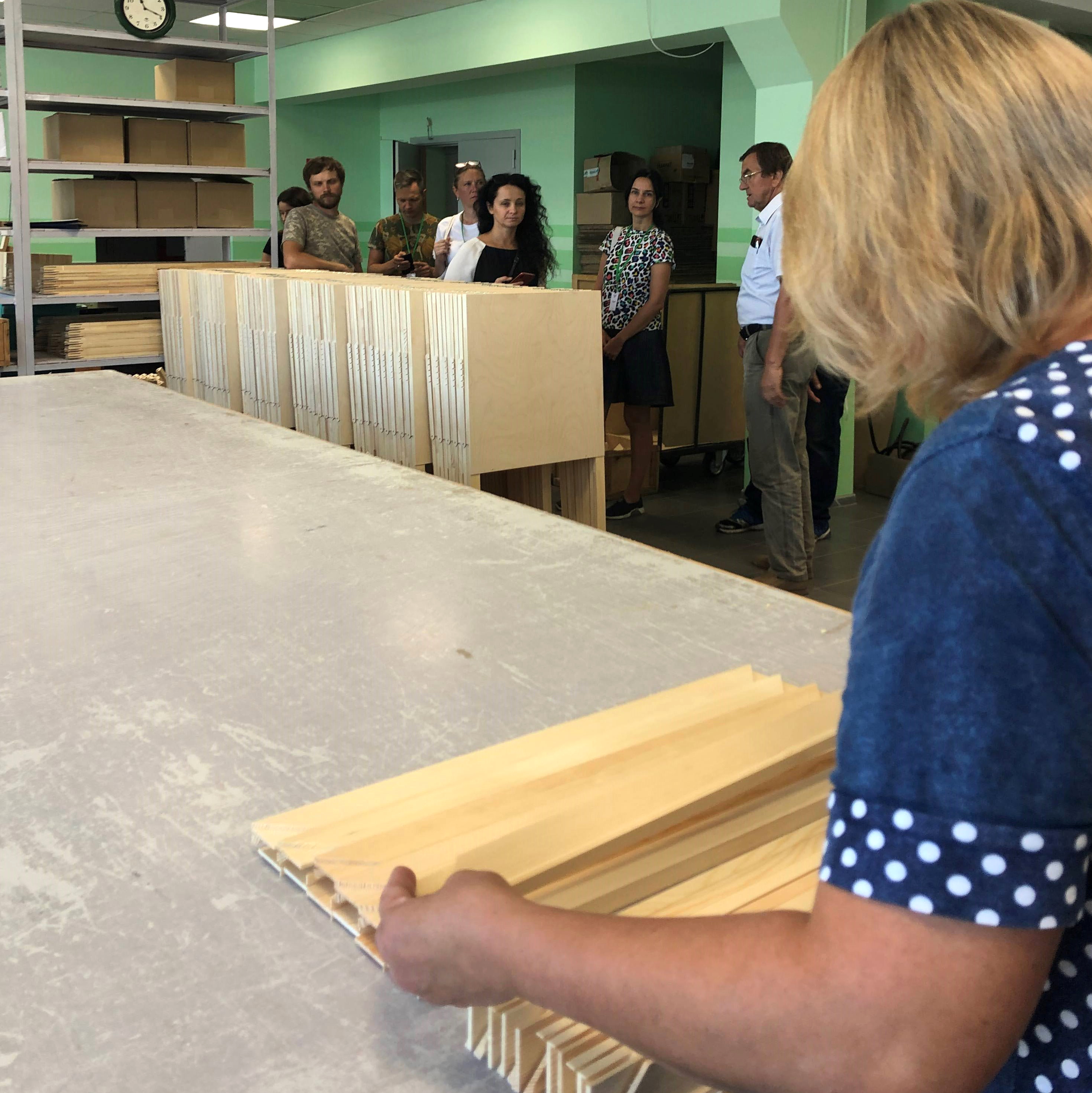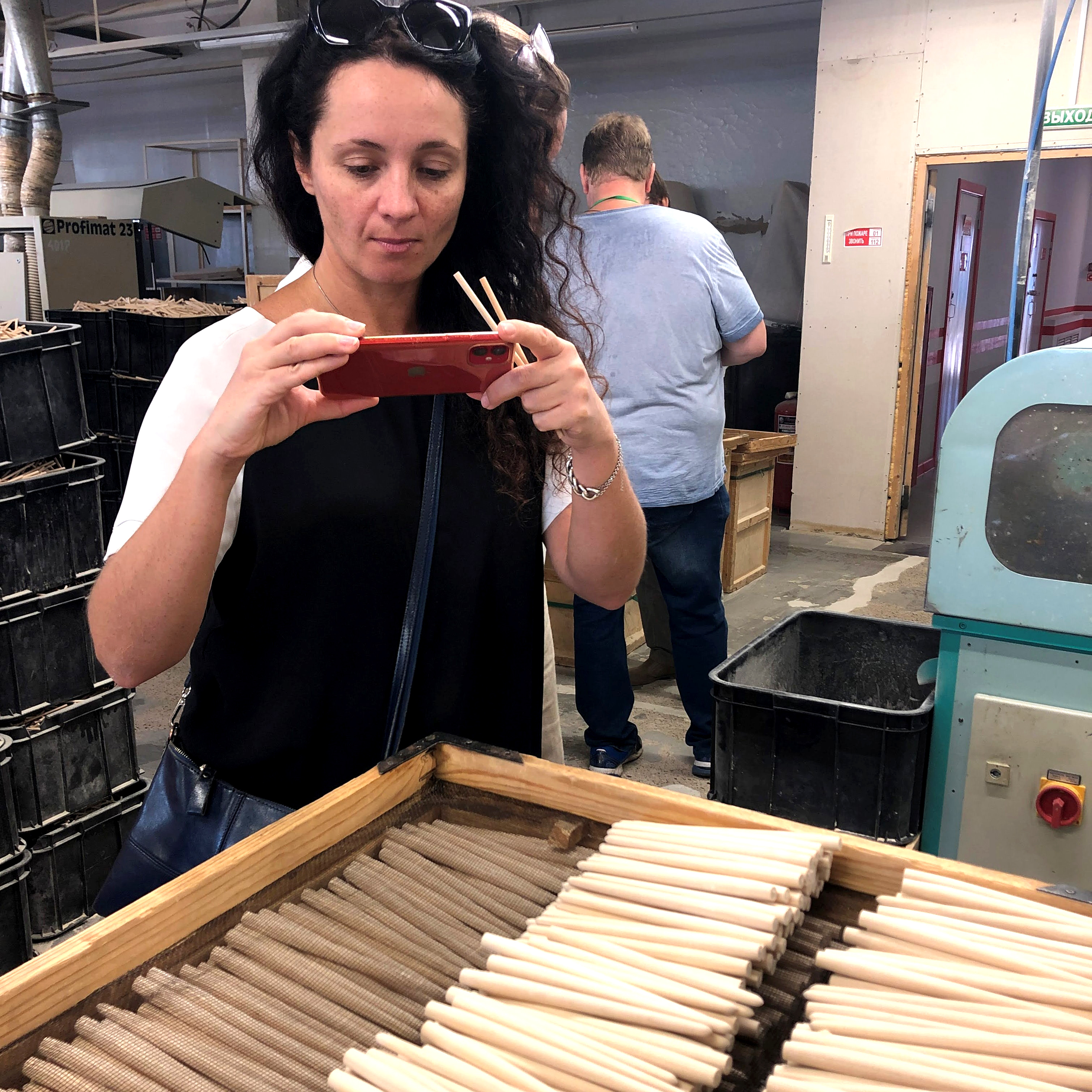 А в один из дней художники всё-таки отложили кисти и приехали с экскурсией на фабрику. Важных гостей провели по цехам, показали технологию обработки древесины и волоса кистей, шлифовки ручки и ручной сборки кистей.