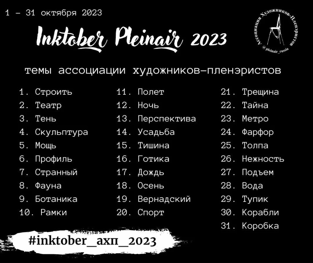 Ассоциация художников-пленэристов запускает ежегодный чёрно-белый флешмоб INKTOBER PLEINAIR. Таким образом российские участники присоединяются к всемирному движению «Инктобер», но рисуют исключительно на пленэре.