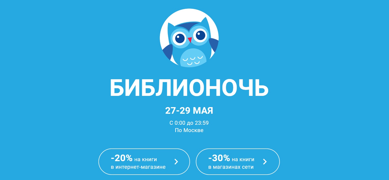 «Библионочь» в «Читай-городе» будет проходить три дня — с 27 по 29 мая. Всё это время на всех площадках магазина будут действовать скидки: –20 % на всё в интернет-магазине и –30 % в розничной сети.