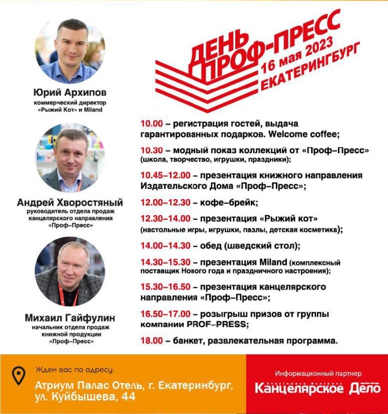 В программе презентации от руководителей канцелярского и книжного направлений «Проф-Пресс», компаний «Рыжий кот» и «Миленд» и модный детский показ коллекции к школьному сезону — 2023.