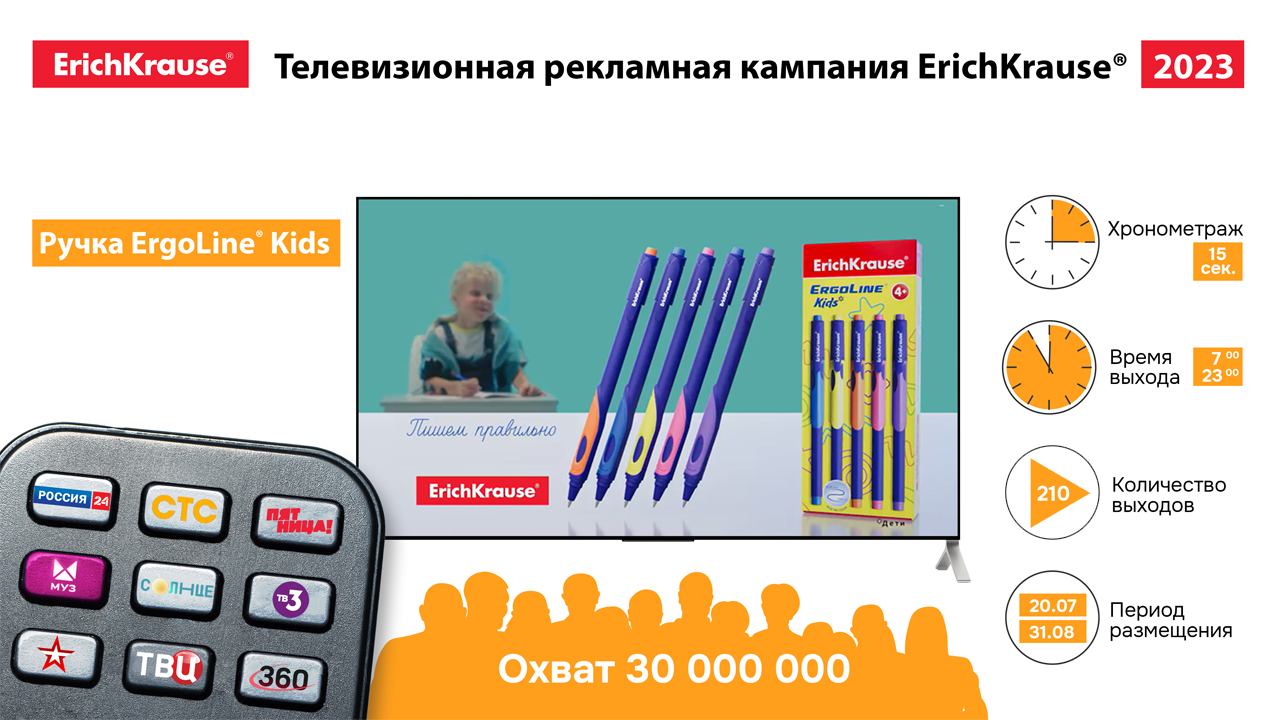 20 июля стартует масштабная телевизионная рекламная кампания ручек ErgoLine® Kids и R-301. Она завершится 31 августа, накануне Дня знаний и начала школьных и студенческих занятий.