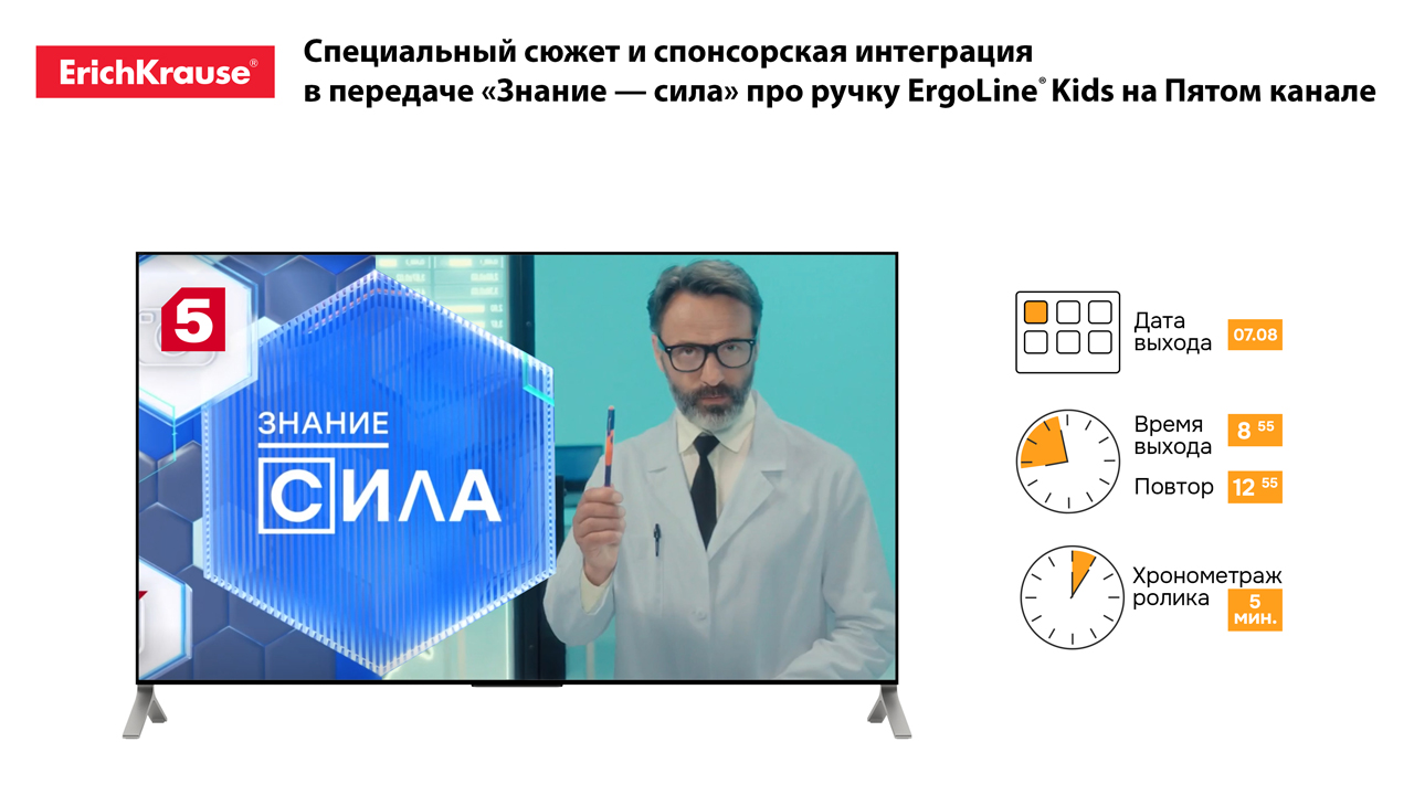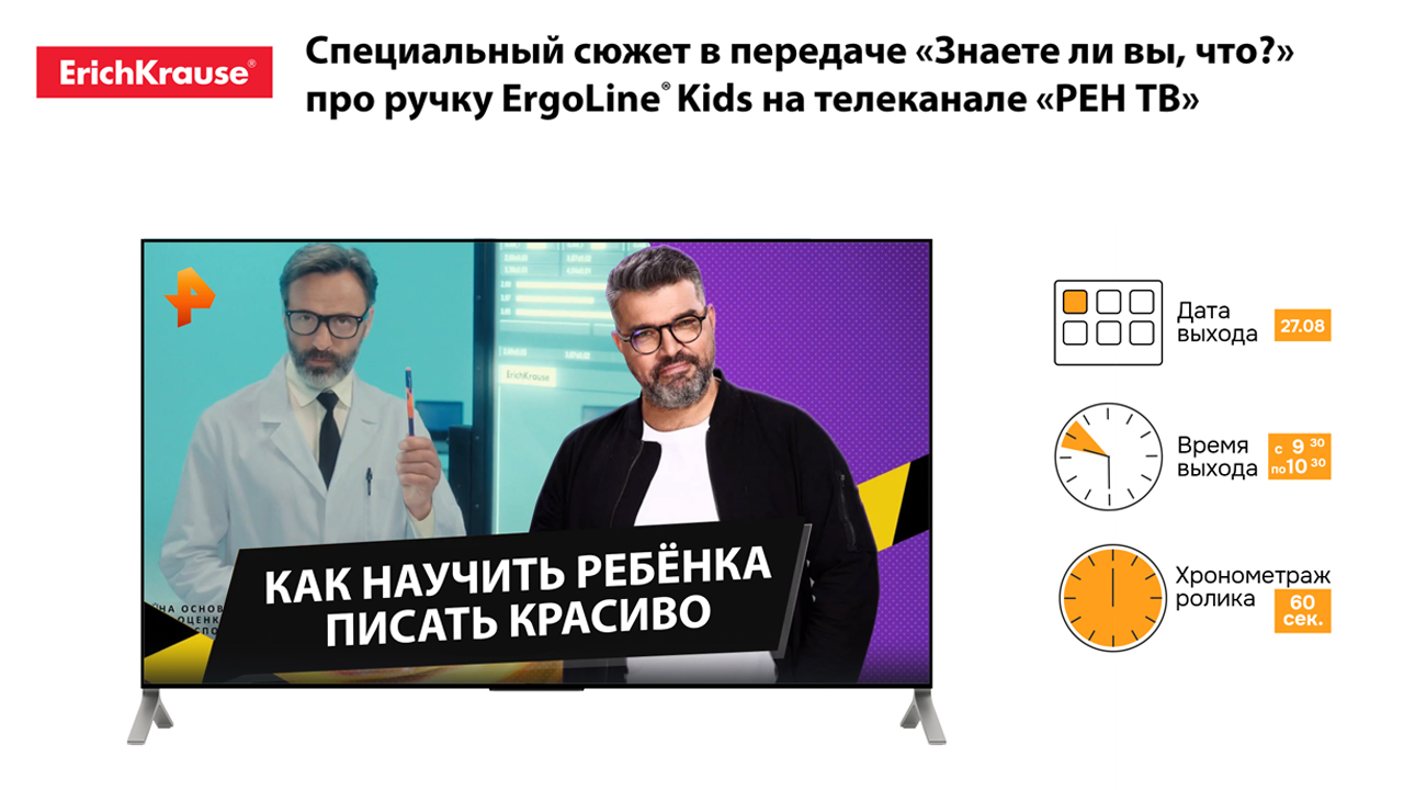 Кроме того, 7 августа, в 8:55, на Пятом канале выйдет специальный пятиминутный репортаж и спонсорская интеграция о ручке модели R-301, повтор будет в тот же день, в 12:55. А 27 августа, в 9:30, в передаче «Знаете ли вы, что?..» в эфире телеканала «РЕН-ТВ» будет специальный сюжет «Как научить ребёнка писать красиво» хронометражем 60 секунд, рассказывающий о модели ErgoLine® Kids.