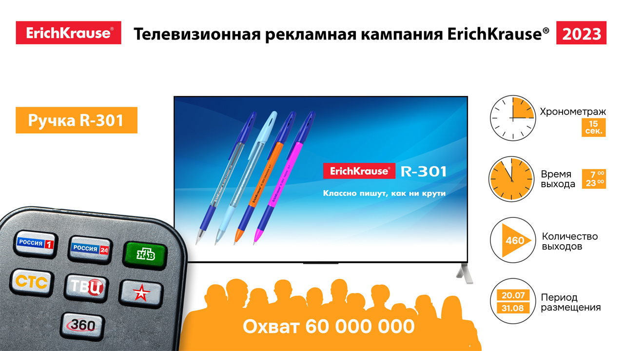 Рекламные ролики будут выходить в течение всего дня, с 7 утра до 23 часов, включая вечерний прайм-тайм. Суммарный охват аудитории по всей стране составит 90 млн человек. Кроме того, телевизионная кампания будет поддержана наружной рекламой Erich Krause по всей стране в течение всего августа.