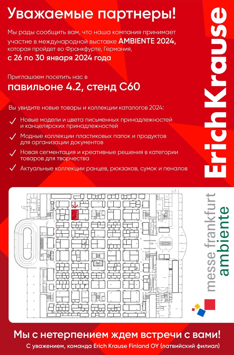 Erich Krause станет участником Международной выставки AMBIENTE-2024, которая пройдёт во Франкфурте, Германия, с 26 по 30 января 2024 года. Приглашаем посетить наш стенд С60 в павильоне 4.2.