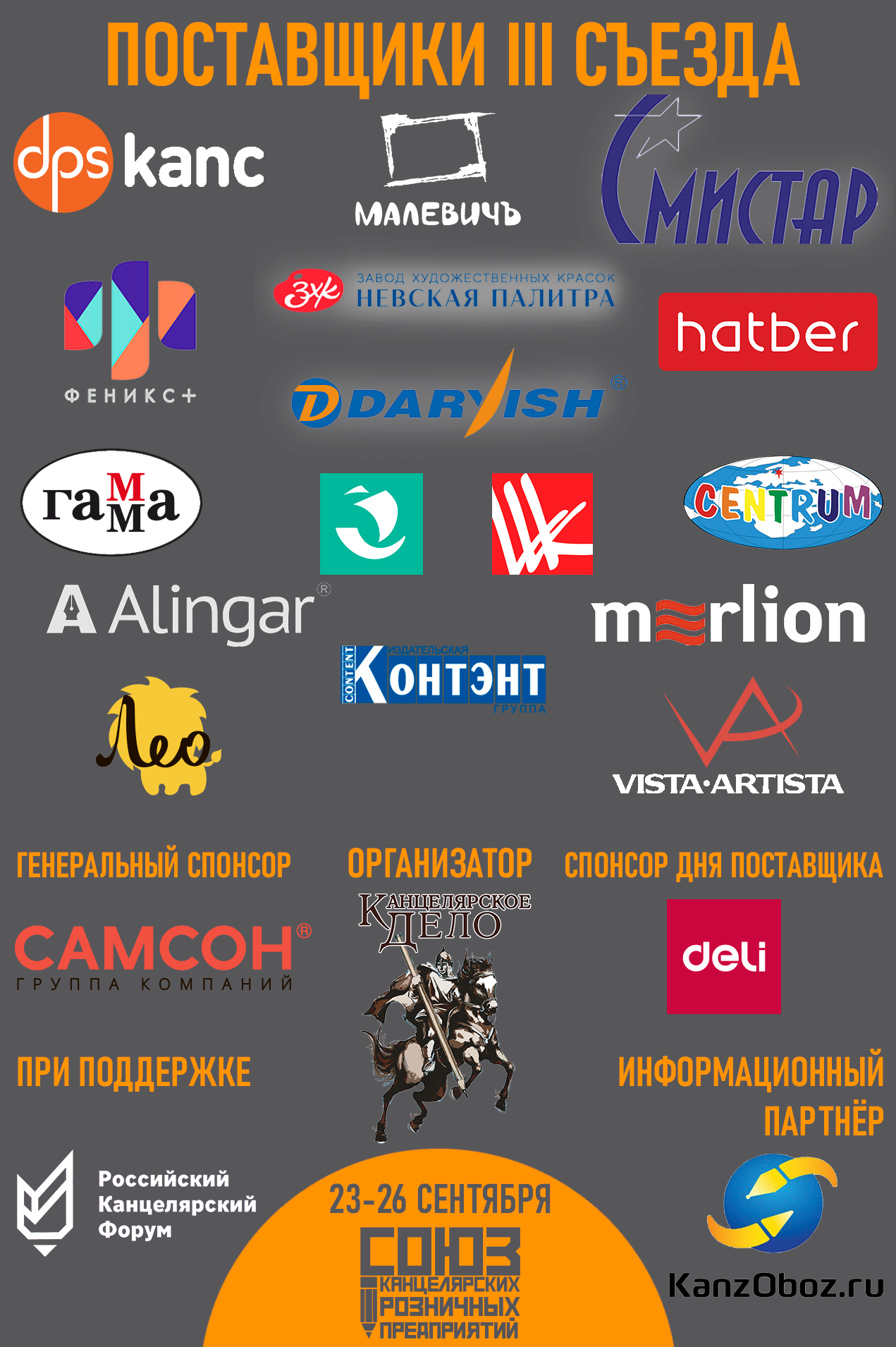 С 23 по 26 сентября в Москве состоится III Съезд «Союза Канцелярских Розничных Предприятий». Он будет предварять выставку «Мир детства». Генеральный спонсор мероприятия — ГК «Самсон». III Съезд СКРП — это новые знакомства, полезные контакты и море информации для повышения эффективности вашей работы. В комфортной обстановке участники обсудят результаты работы, текущую ситуацию на рынке и отдохнуть в хорошей компании.