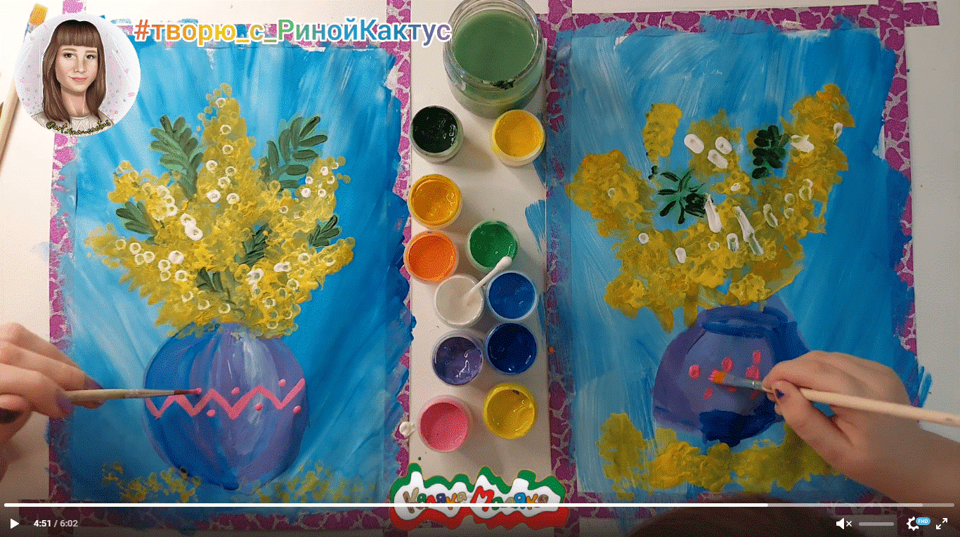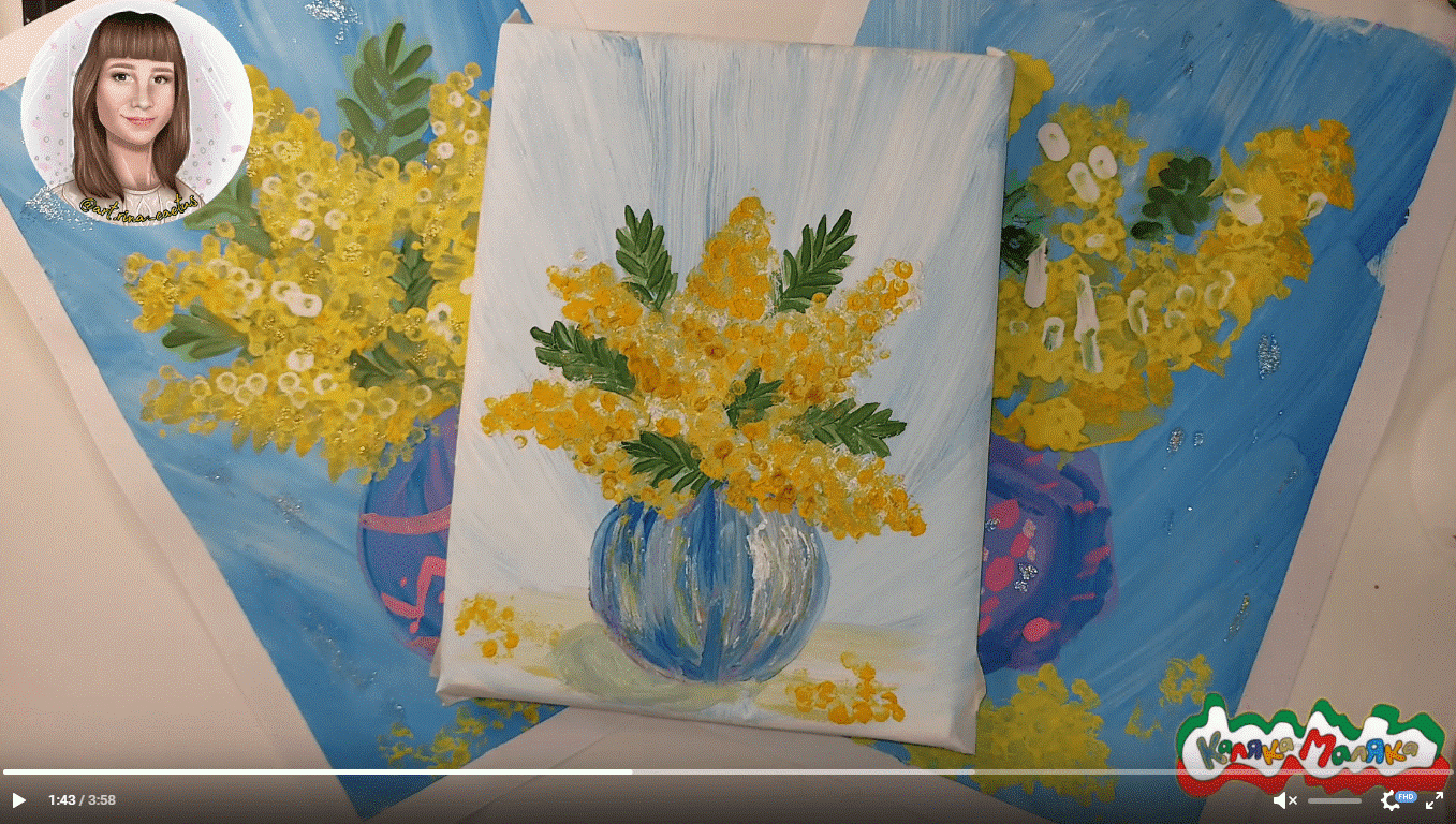 А вот и сам мастер-класс! Только посмотрите на эти шикарные букеты мимозы. Одним из самых весенних цветов получились у мамы с дочкой просто великолепно. И всё это гуашью для маленьких (и больших) художников от «Каляки-Маляки».