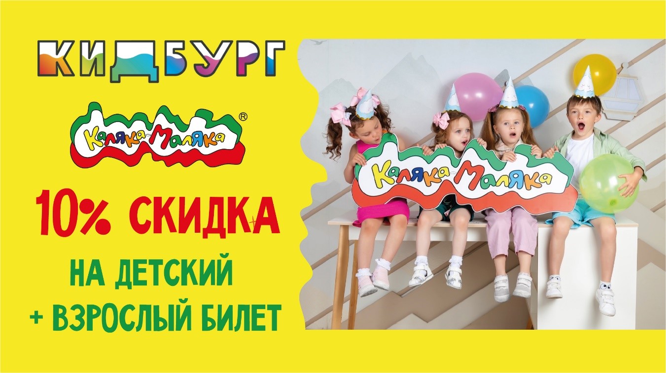 Приходите в «Кидбург» вашего города 27 мая, в 13:00. Всех, кто предъявит флаер, ждёт скидка 10 % на входной билет.