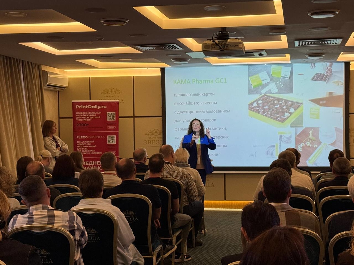 С докладом выступила менеджер по работе с ключевыми клиентами комбината «КАМА» Ольга Соболева. Особое внимание в презентации было уделено новинкам 2025 года: картонам KAMA Strong и KAMA Bright плотностью 170 и 180 г/кв. м для создания высококачественной кашированной упаковки и бумаге для этикеток Ural Bright Label массой 80 г/кв. м.