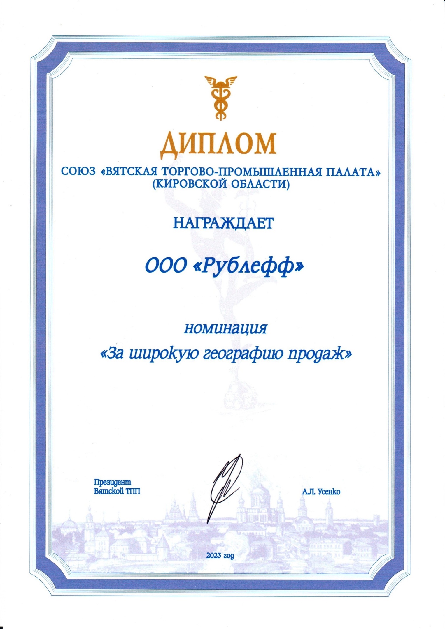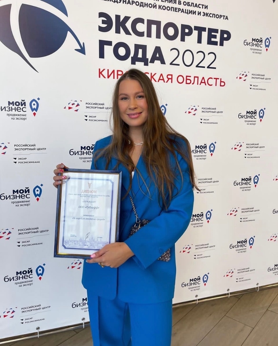 В Кирове состоялась торжественная церемония подведения итогов регионального этапа конкурса «Экспортёр года». По итогам работы комиссией были определены 24 победителя в 9 номинациях конкурса. «Рублёфф» получил диплом Вятской торгово-промышленной палаты в номинации «За широкую географию продаж».
