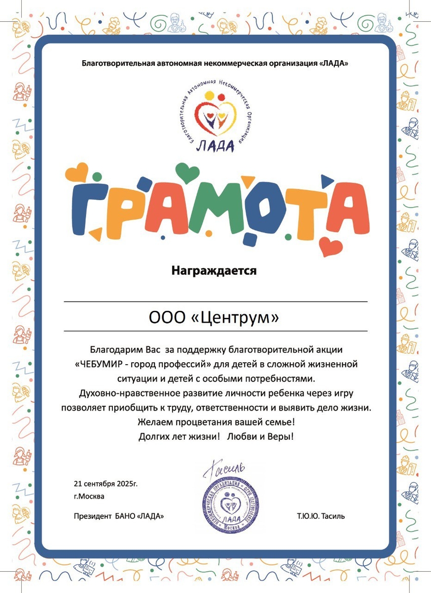 Компания «Центрум» приняла участие в благотворительном празднике для детей, оказавшихся в трудной жизненной ситуации «ЧЕБУМИР — город профессий».