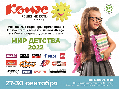«Комус» приглашает посетить свой стенд на27-й Международной выставке «Мир детства — 2022». Она будет проходить с 27 по 30 сентября в Москве по адресу: Краснопресненская наб., 14, ЦВК «Экспоцентр», павильон 2, зал 3.