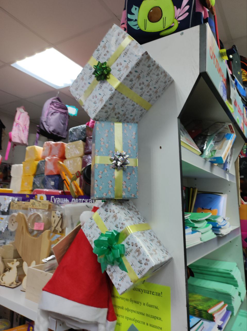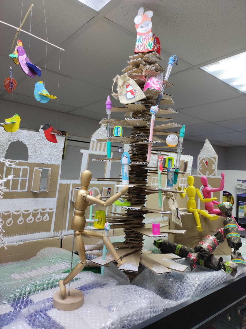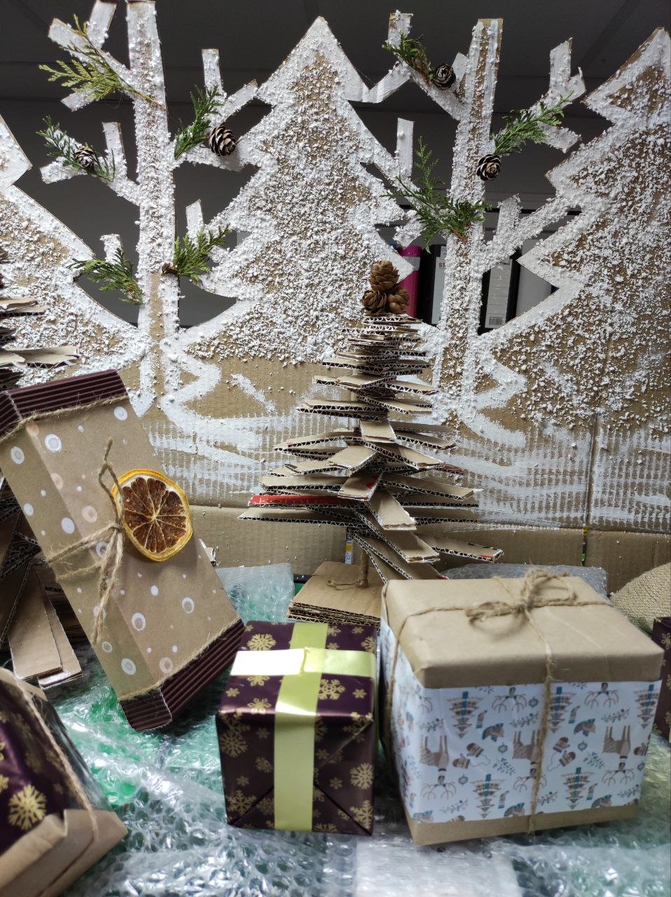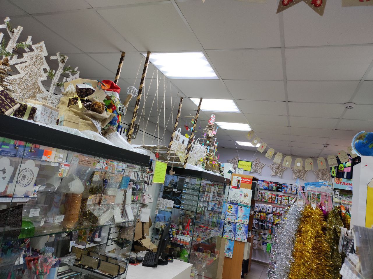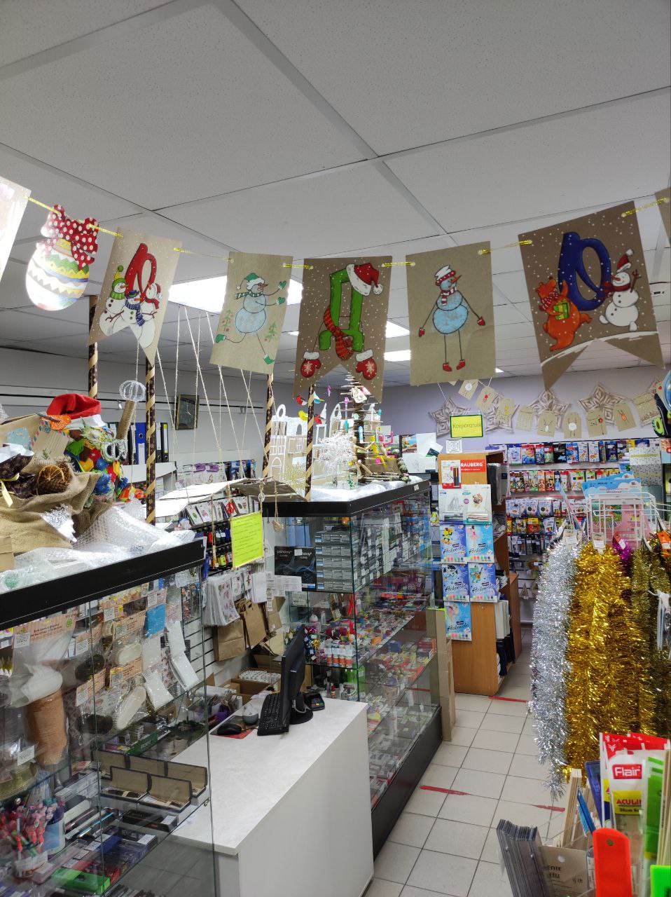 Тематикой украшения магазина в этом году стало использование экологических материалов в стиле крафт. За основу брали картон, крафтовую бумагу различной плотности и, чтобы придать красок, — гуашь, акрил, пастель, цветные карандаши, фломастеры, маркеры, алмазную мозаику, упаковочную бумагу, банты, бисер, декоративные ленты, сопутствующие товары: резаки, ножницы, кисти художественные, палитры, клей, ластики, ч/г карандаши, джутовый шпагат. Для украшения новогодней елки — точилки, ручки, карандаши, ластики, клей, подарочные мешочки, манекен деревянный.