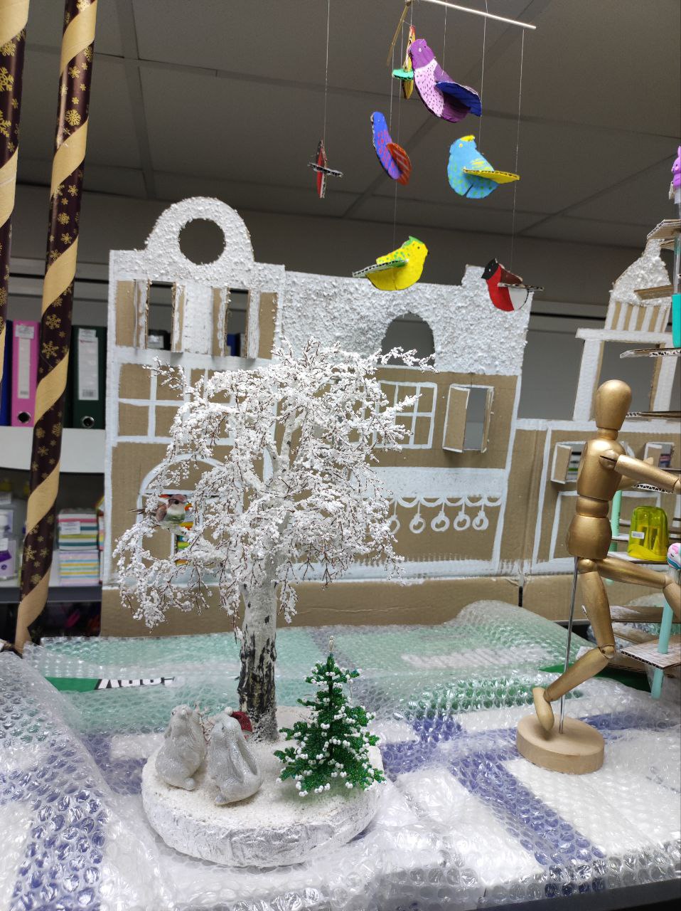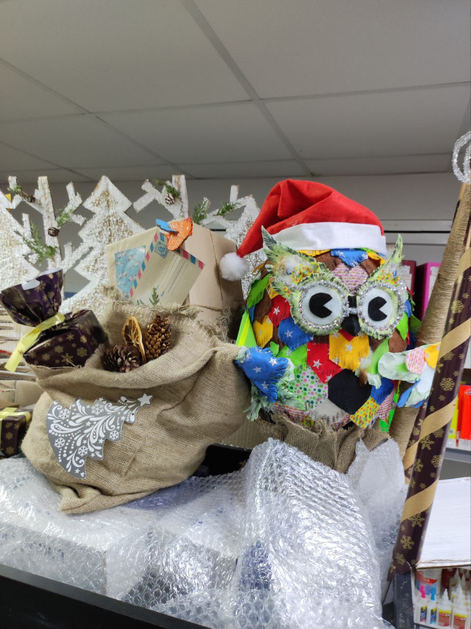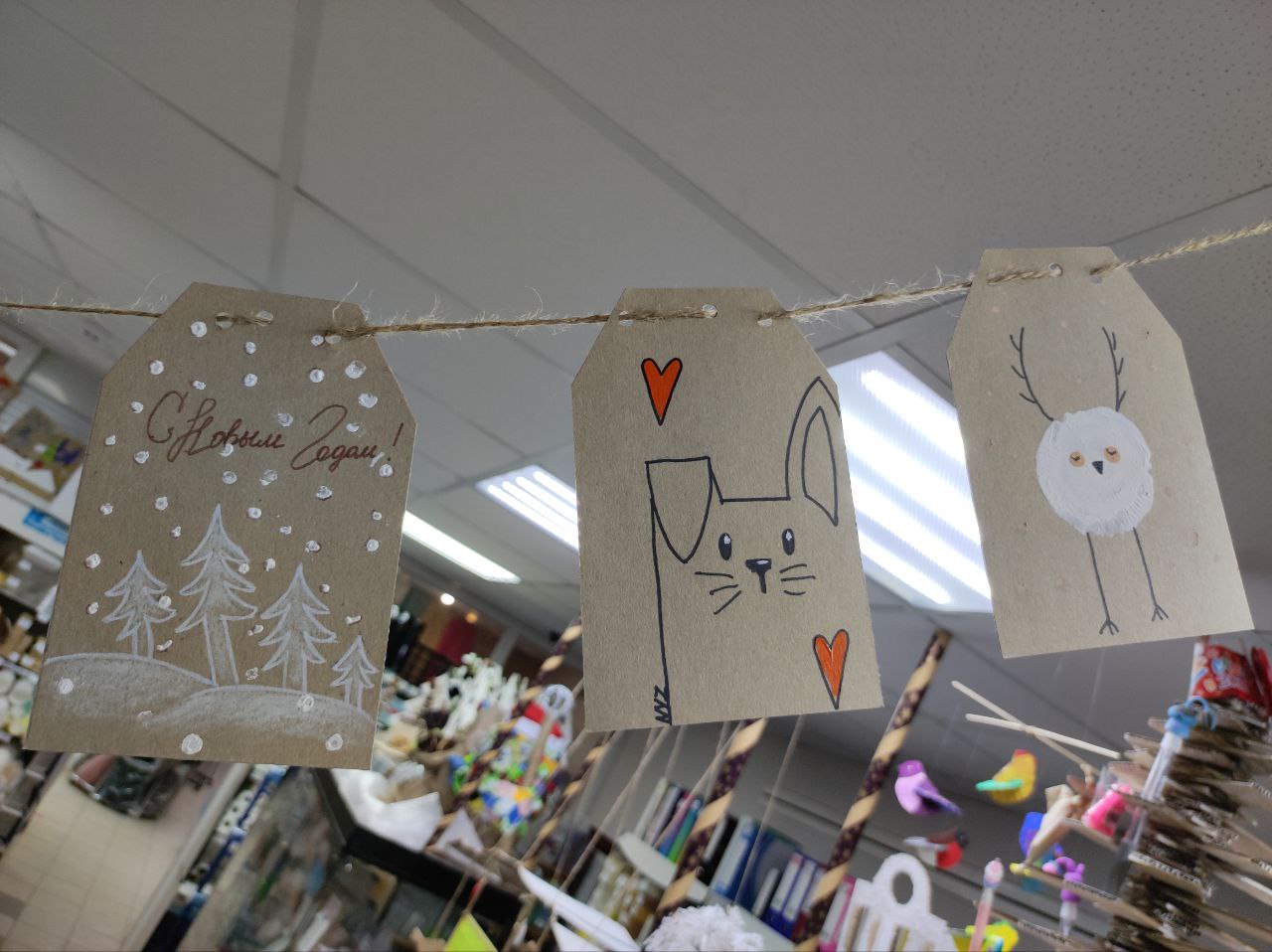 Тематикой украшения магазина в этом году стало использование экологических материалов в стиле крафт. За основу брали картон, крафтовую бумагу различной плотности и, чтобы придать красок, — гуашь, акрил, пастель, цветные карандаши, фломастеры, маркеры, алмазную мозаику, упаковочную бумагу, банты, бисер, декоративные ленты, сопутствующие товары: резаки, ножницы, кисти художественные, палитры, клей, ластики, ч/г карандаши, джутовый шпагат. Для украшения новогодней елки — точилки, ручки, карандаши, ластики, клей, подарочные мешочки, манекен деревянный.