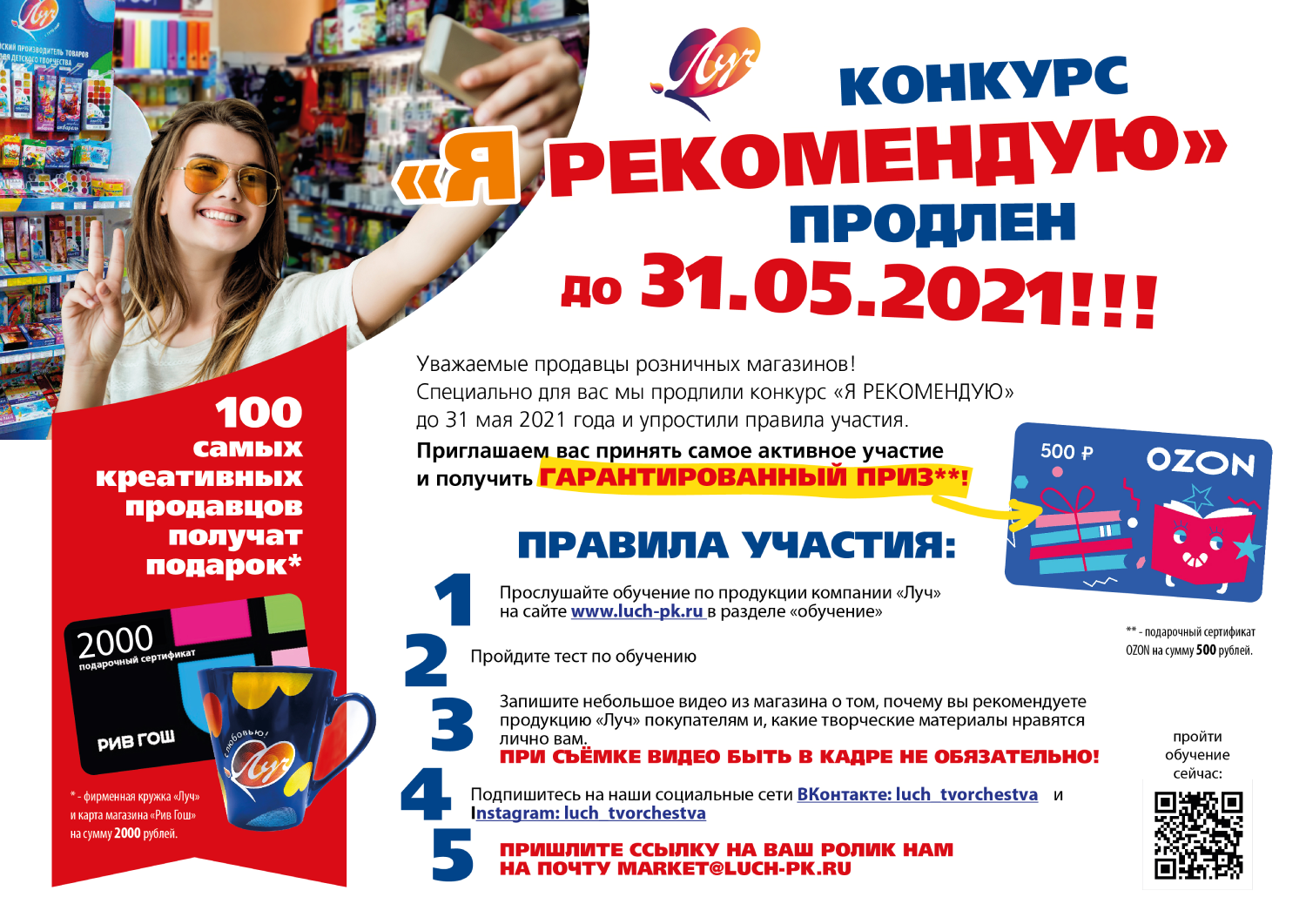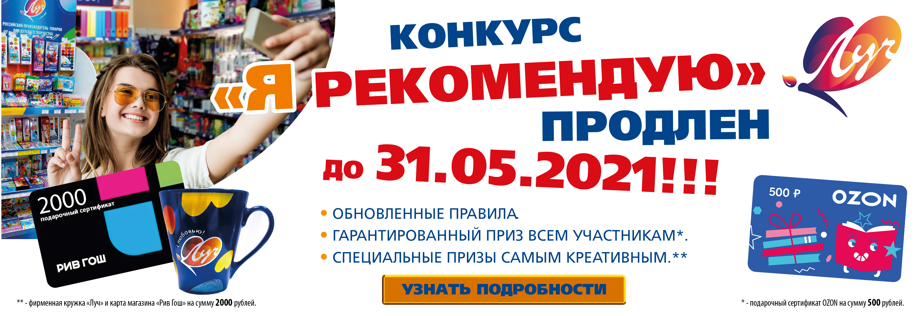 Конкурс «Я рекомендую!» от компании «Луч» стартовал 1 марта, а теперь продлевается до 31 мая. Если вы продавец канцелярского магазина, в котором представлена продукция торговой марки, спешите принять участие.