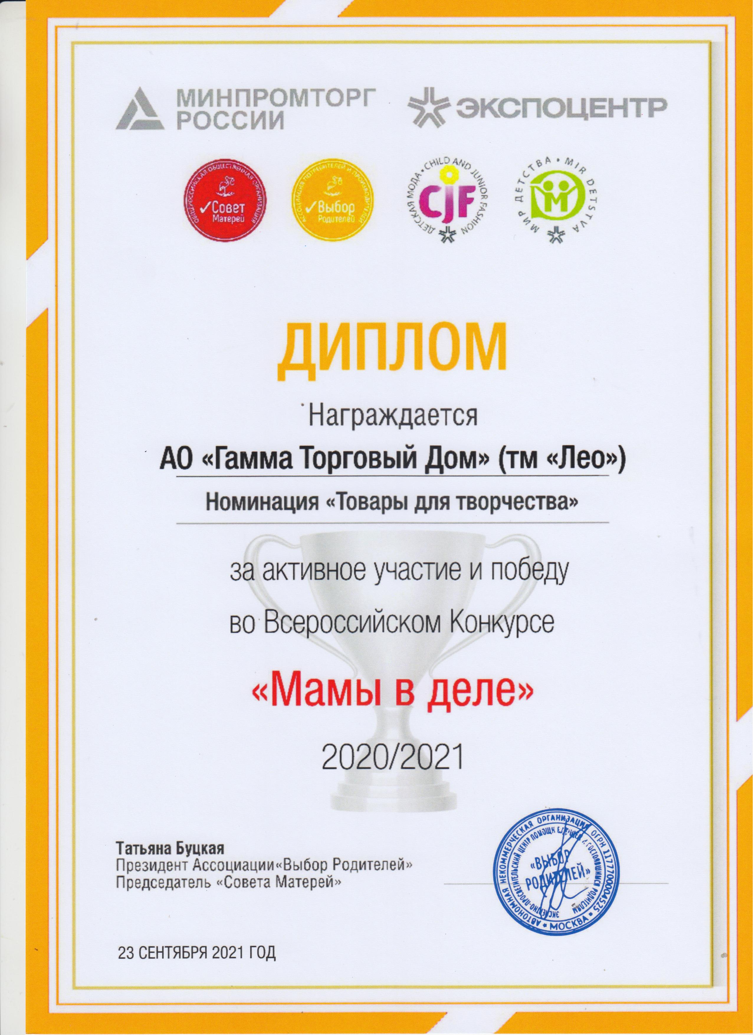Пластилин бренда «Лео» от фирмы «Гамма» («Гамма» ТД) принял участие во Всероссийском конкурсе «Мамы в деле», организованном при поддержке Минпромторга России и Ассоциации «Выбор Родителей» в рамках проекта «Амбассадоры Совета Матерей». Продукция успешно прошла тестирование.