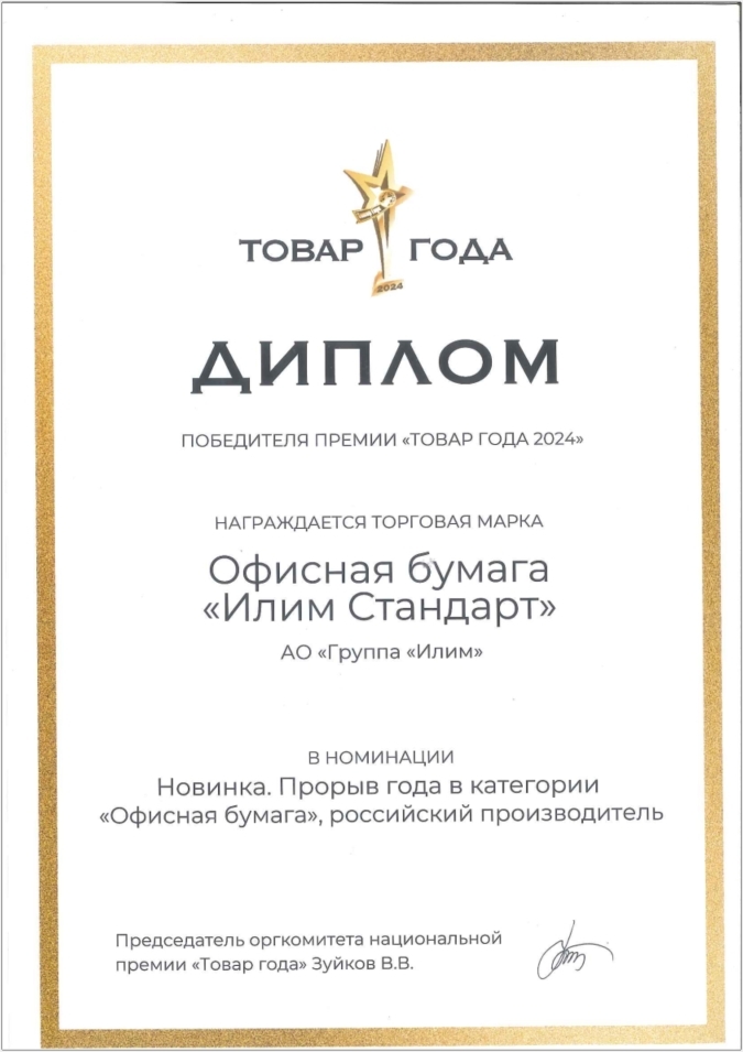 Офисная бумага «Илим Стандарт» награждена национальной премией «Товар года 2024»