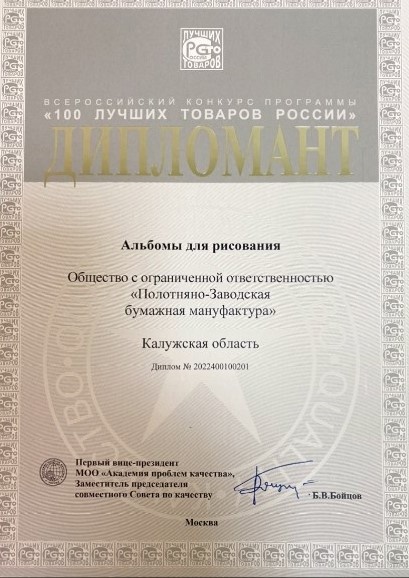 ООО «Полотняно-Заводская бумажная мануфактура» ежегодно принимает участие в Всероссийской программе «100 лучших товаров России». В 2022 году альбомы для рисования производства ООО «ПЗБМ» стали дипломантами в номинации «Промышленные товары для населения».
