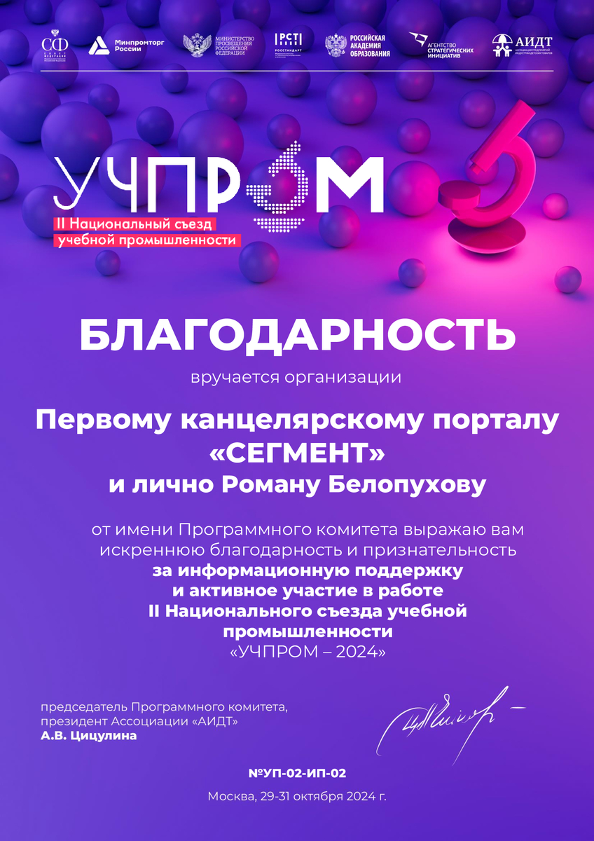 Издание про людей, канцтовары и бумагу «Сегмент.ру» и лично его главный редактор Роман Белопухов отмечены благодарностью за информационную поддержку и активное участие в работе II Национального съезда учебной промышленности «УЧПРОМ-2024» от программного комитета мероприятия. Документ за подписью председателя программного комитета, президента Ассоциации предприятий индустрии детских товаров Антонины Цицулиной есть в распоряжении редакции.