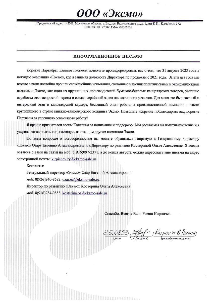 Роман Кирпичёв покидает пост директора по продажам в издательстве «Эксмо». Эту должность он занимал с 2021 года. Роман Кирпичёв подчеркнул, что для него это был интересный и важный этап в канцелярской карьере, бесценный опыт работы в производственной компании.