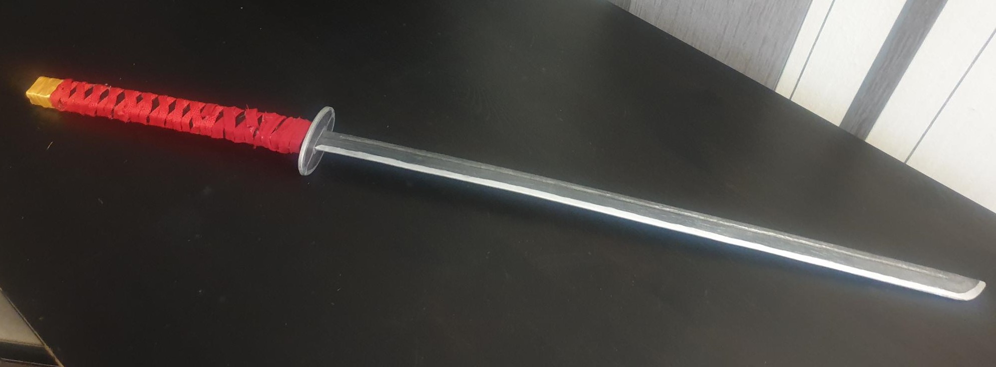 Однажды нам нужно было срочно сделать японскую катану для косплея, в котором участвовала моя дочь. Поскольку лобзика под рукой не оказалось, а меч нужен уже к завтрашнему дню — на помощь пришли деревянные линейки, бумажный скотч и суперклей. Того фото, к сожалению, не сохранилось, но уже через неделю из фанеры и акриловых красок была сделала более долговечная версия катаны, которую вы можете увидеть на фото ниже!