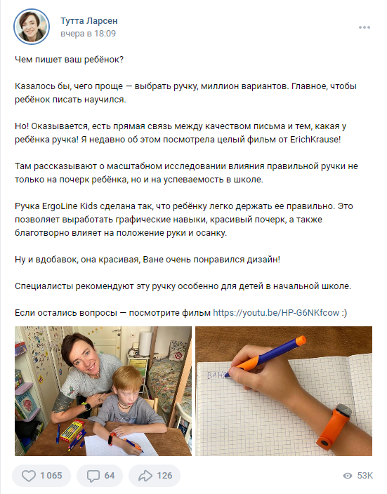Теперь Ваня использует в обучении ручки ErgoLine® Kids, а его мама уверена в правильном выборе.