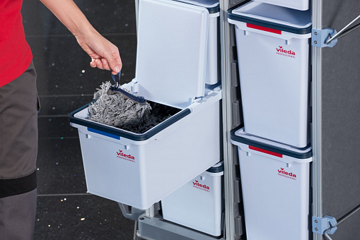 Решение проблемы все же есть это система безведерной уборки СВЕП Про от Vileda Professional. Вместо ведра с грязной водой и неопрятной тряпки оператор уборки применяет заранее увлажненные микроволоконные мопы и салфетки. Клинеры просто меняют насадки на чистые по мере загрязнения и могут дальше продолжать уборку других поверхностей и помещений. Использованные мопы и салфетки стираются в профессиональной стиральной машине