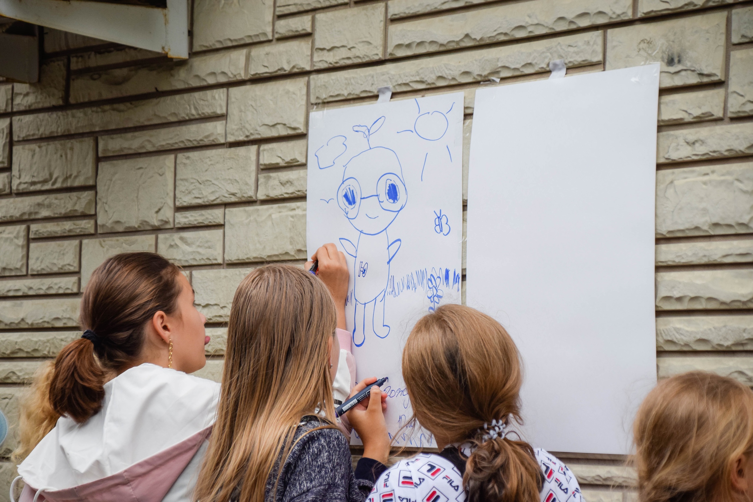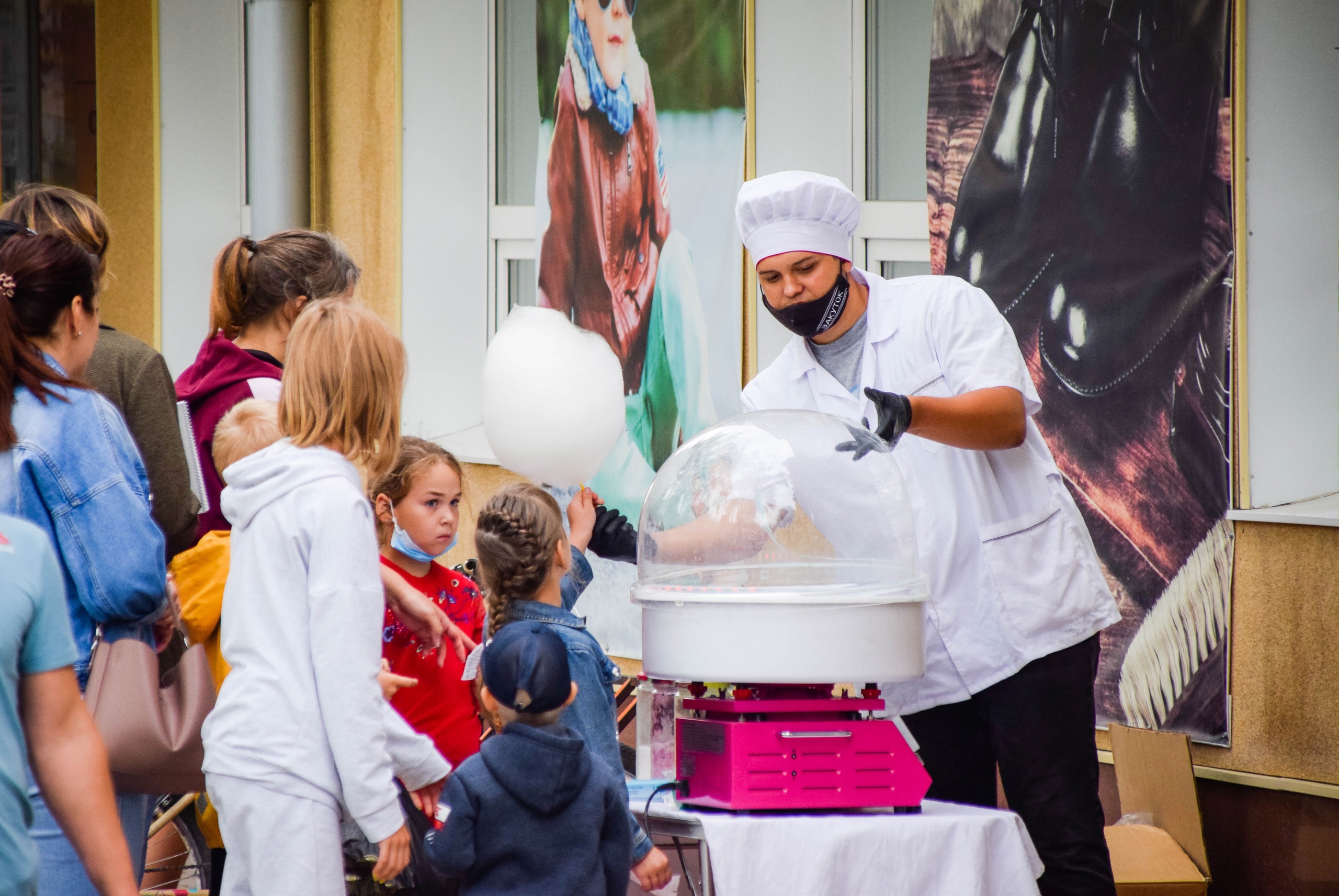 Праздник проходил под открытым небом: звучала музыка, кондитер готовил сладкую вату, а забавный пришелец Юнландик — символ бренда «ЮНЛАНДИЯ» — фотографировался с гостями, участвовал в проведении конкурсов и даже позировал юным художникам.