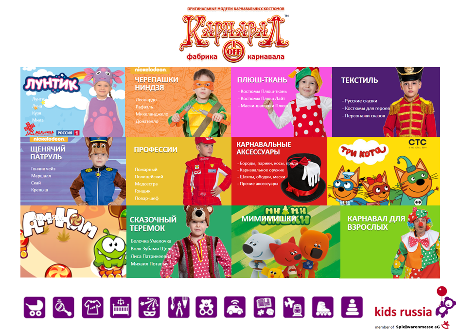 Оригинальные карнавальные костюмы для детей и взрослых торговой марки «КАРНАВАЛОФФ» – это широкий и сбалансированный ассортимент; популярные модели различных комплектаций, возрастных, размерных и ценовых категорий; ежегодное обновление коллекции.
