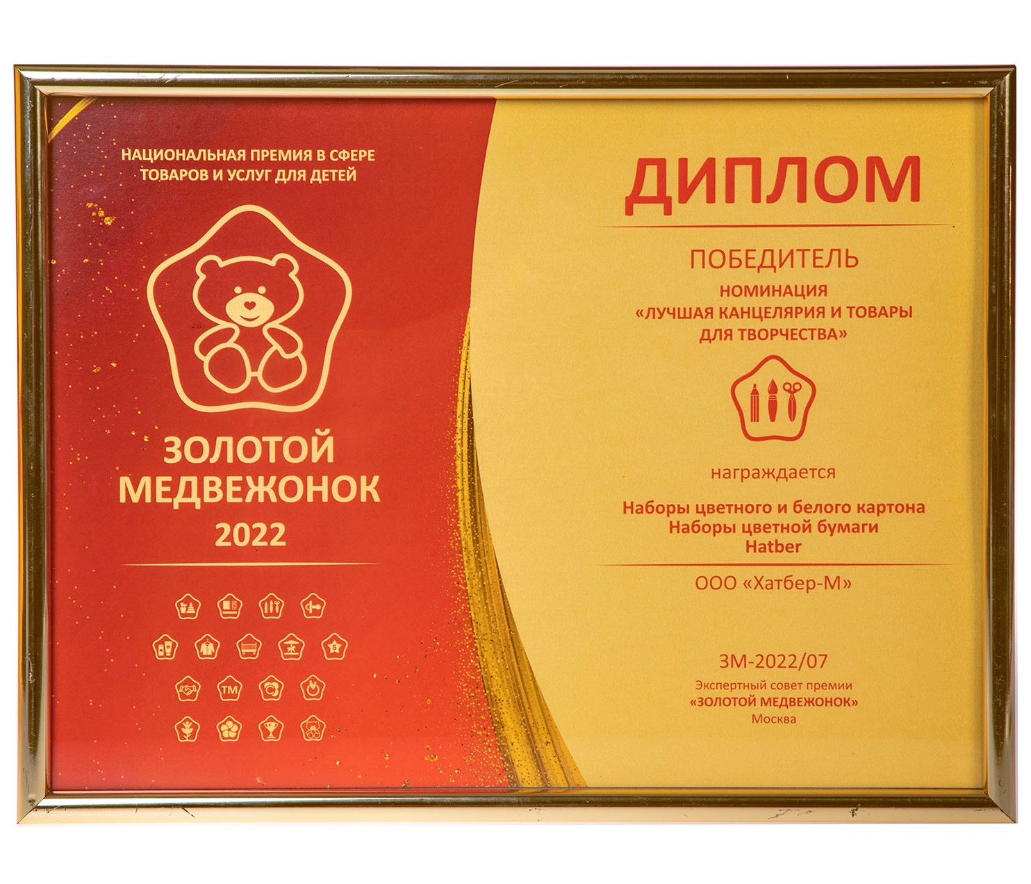 Наша компания заняла 1-е место в номинации «Лучшая канцелярия, хобби и творчества»: наборы цветного и белого картона, наборы цветной бумаги ООО «Хатбер-М».