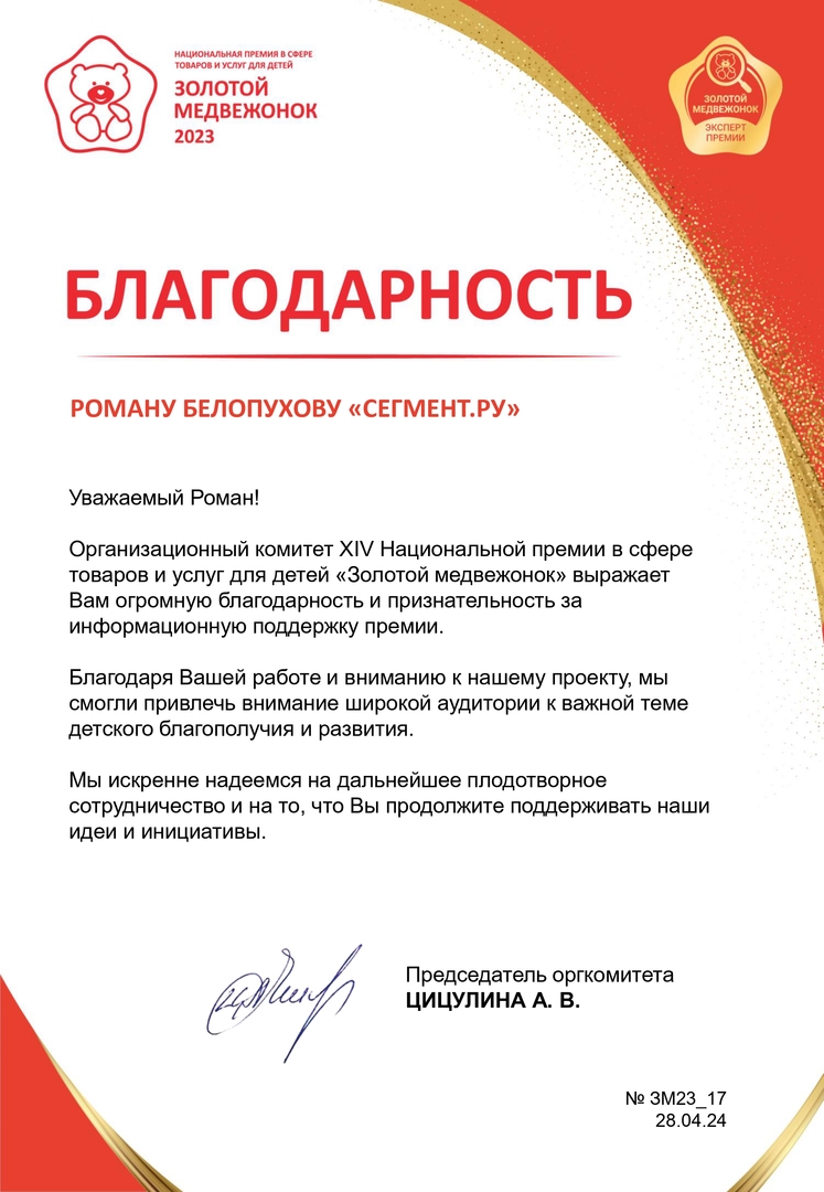 Оргкомитет премии «Золотой медвежонок» благодарит редакцию «Сегмент.ру»