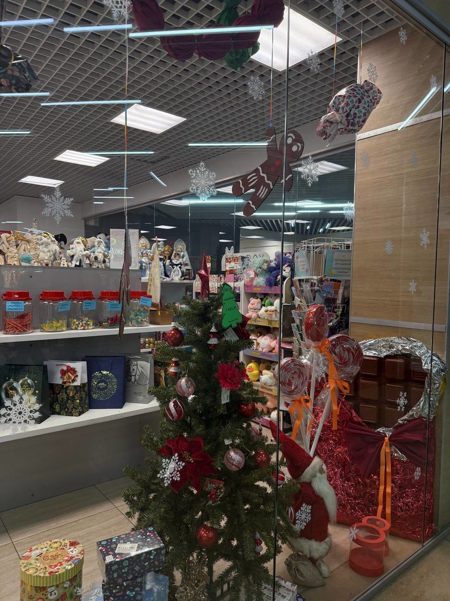 К Новому году мы создали в магазине атмосферу уюта, волшебства и праздничного настроения. Центральным элементом стала украшенная новогодняя ёлка с красно-золотыми акцентами, символизирующими тепло, радость и ожидание праздника. Витрина и торговый зал дополнены снежинками, подвесным декором, подарочными элементами и новогодними персонажами. Особое внимание уделено деталям — декоративные сладости, подарки и игрушки гармонично сочетаются с ассортиментом магазина, создавая ощущение настоящей новогодней сказки. Мы стремились сделать так, чтобы каждый покупатель, заходя к нам, ощущал праздничное настроение и вдохновение, ведь Новый год — это время новых идей, планов и начинаний.