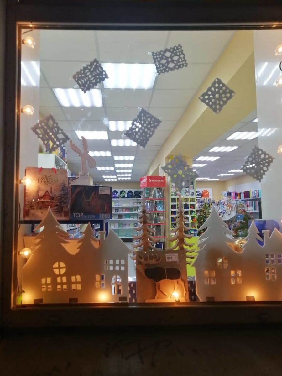 Были использованы остатки пенопласта от упаковок, старые коробки, детские игрушки, рисунки детей продавцов, ёлки, гирлянды и мишуру (единственное финансовое вложение). Всего на оформление десяти магазинов потратили менее 10 тысяч рублей, доказывая, что бюджетные решения тоже могут выглядеть стильно и оригинально!