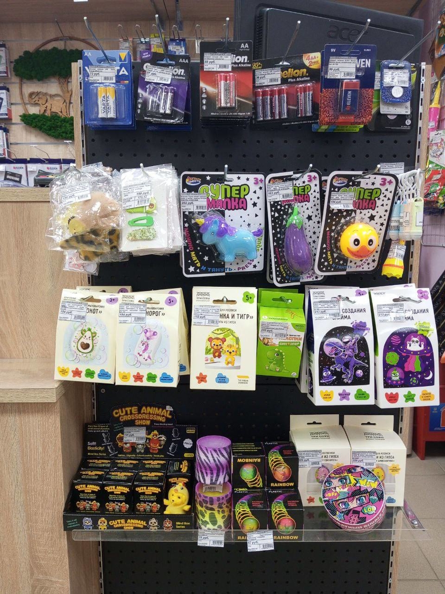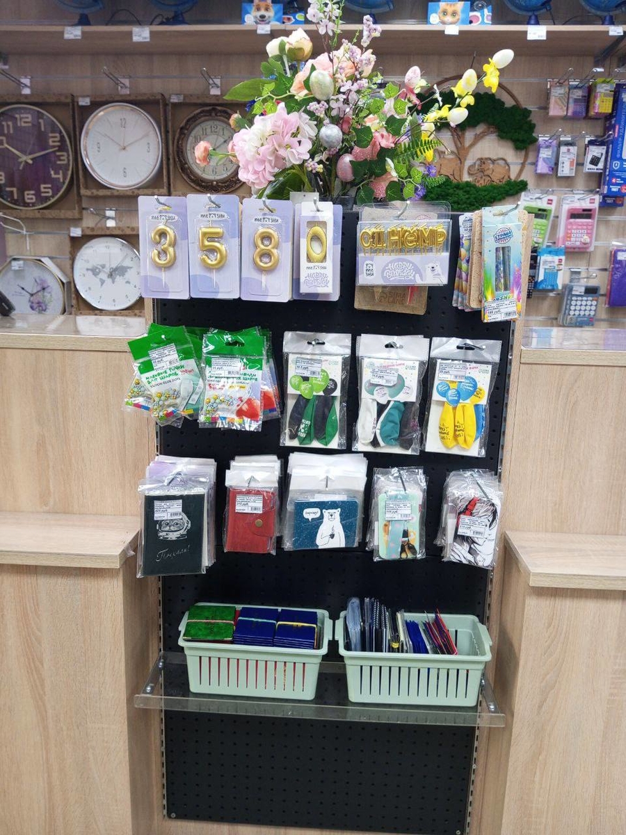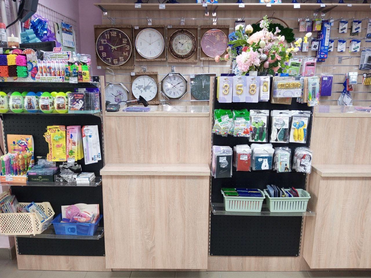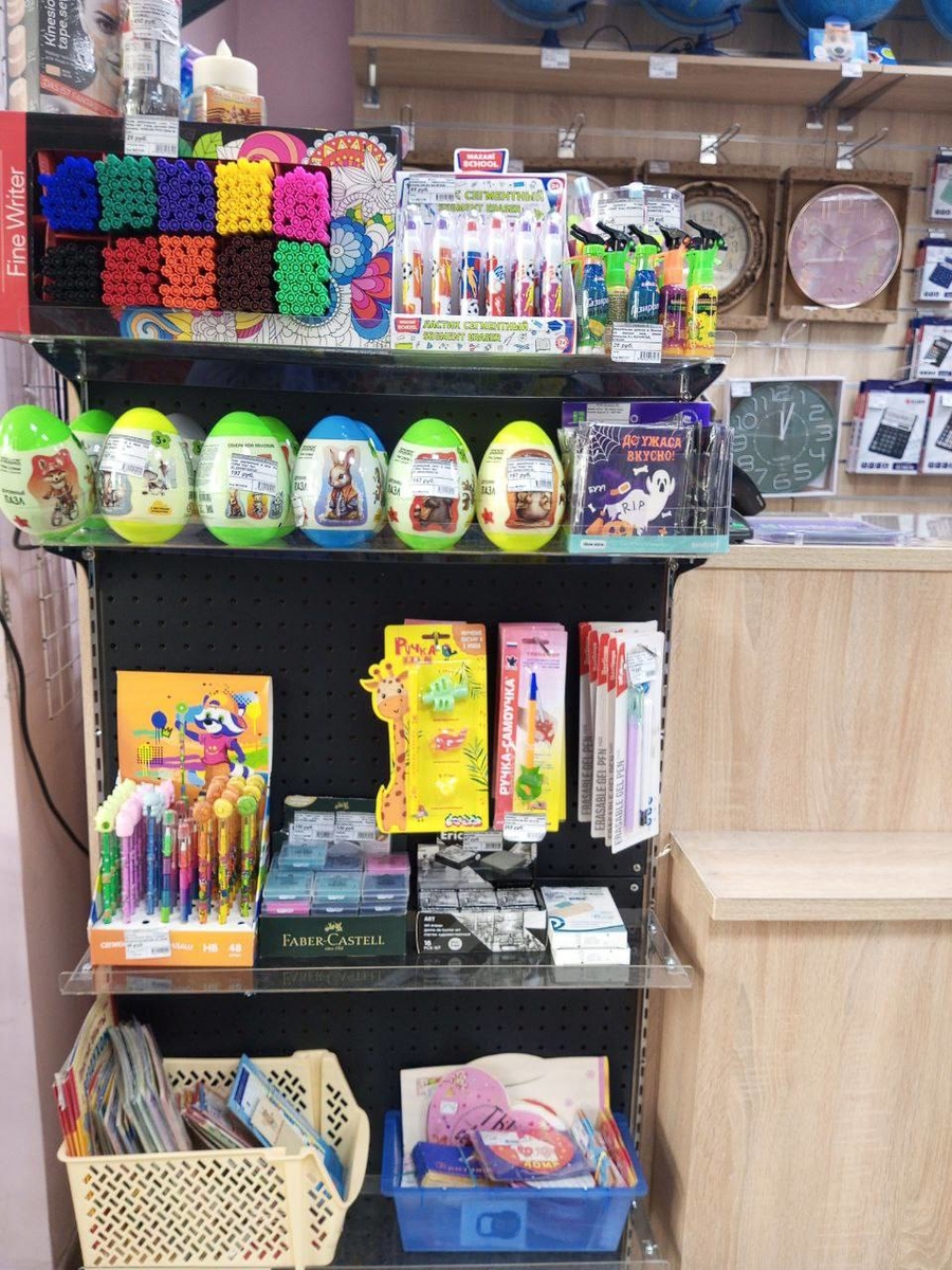 На предкассовой зоне у нас выложены товары для творчества: мыловарение, наборы для росписи, слаймы, раскопки, деревянные пазлы и т. д, всё, что может привлечь внимание детей. Также выставлены товары ко дню рождения: свечи, шарики, элементы для крепления шаров. Имеются в наличии различные бейджи для школьников, кожгалантерея в виде обложек для паспортов, автодокументов, визитниц и т. д. Выставлены на предкассовой зоне сладости для детей, пользуются особой популярностью. Отдельно вывешены товары для детей, которые учатся писать. Также представлены новинки в виде сегментных ластиков, карандашей, ластиков-клячек. Для удобства покупателей выставлены пособия (шпаргалки) по различным предметам. Периодически товар на кассе заменяется на другие новинки или товары, привлекающие внимание покупателей.