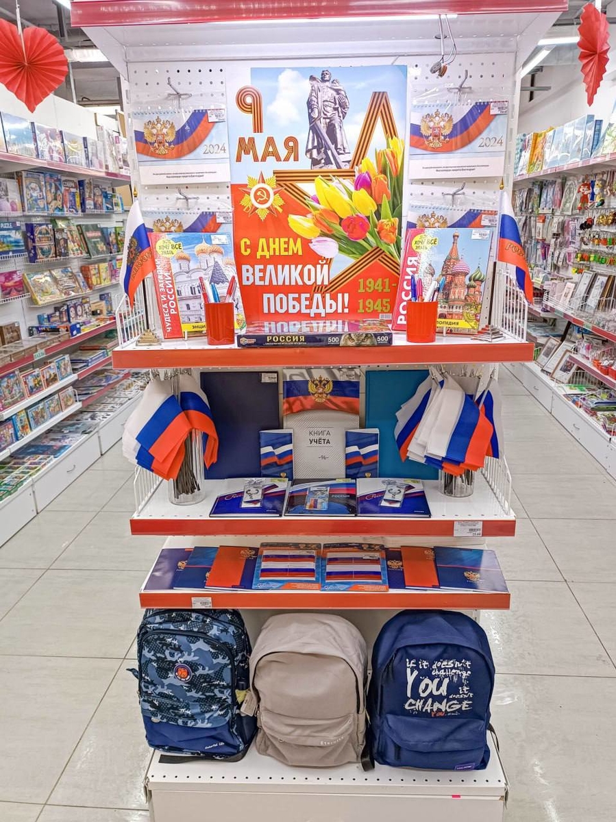 Прикассовую зону стараемся обновлять часто, это зависит от приближающихся праздников и времени года, так как товары прикасовой зоны — это в большей степени импульсные покупки, поэтому товар стоящий на кассе должен быть с высокой рентабельностью. Осталось очень мало времени для подготовки к Дню Победы! В детских садах, школах к этому празднику украшают окна, классы, залы. День Победы — гордость, боль и память. В сети магазинов «ЛистОк» представлен широкий ассортимент товаров к празднику.
