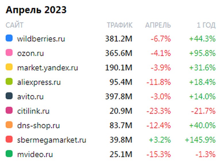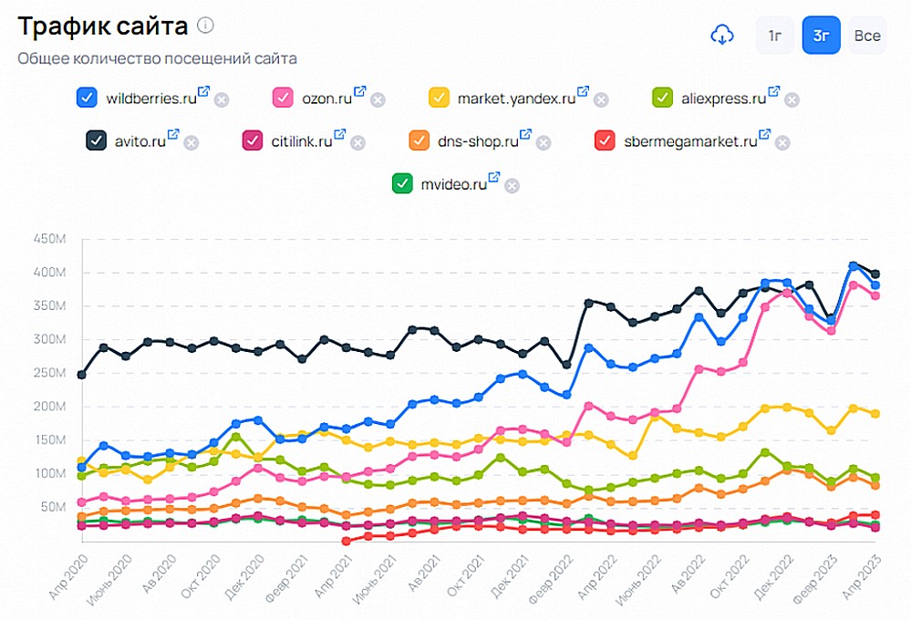 По итогам апреля 2023 года трафик сайтов маркетплейсов WildBerries и Ozon почти сравнялись, а на первое место вновь вырвался Avito, следует из данных портала Metrica.