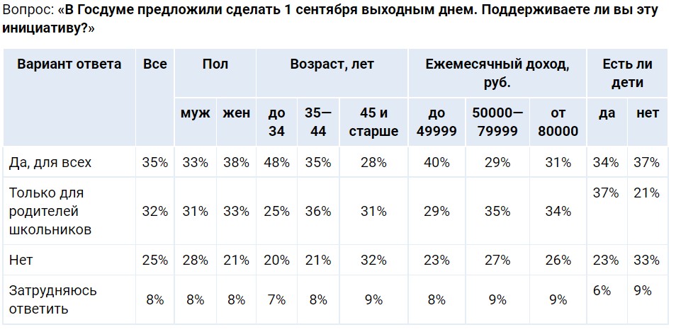 Итак, два из трёх респондентов поддерживают идею о выходном дне 1 сентября.