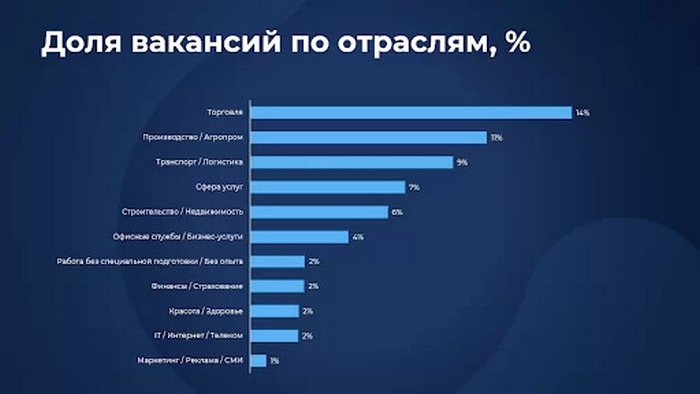 - Больше всего вакансий было в сфере торговли — 14 % от общего числа предложений.