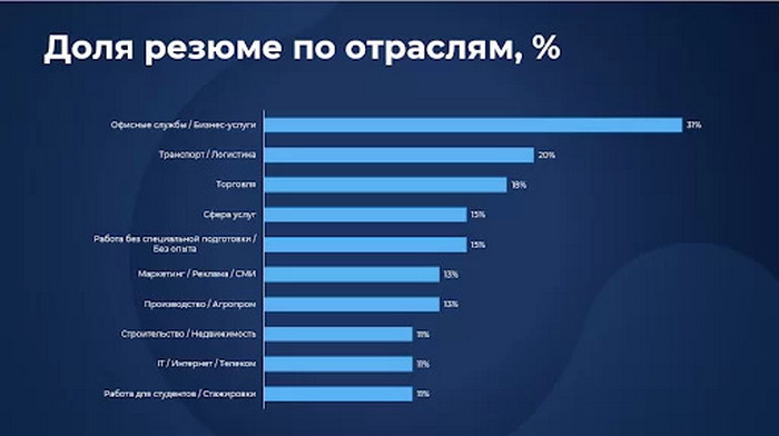 - с офисных службах и бизнес-услугах — 31 % от общего числа резюме;