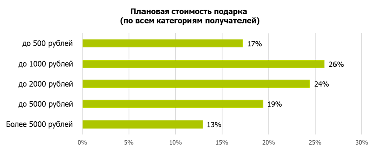 У 24 % респондентов хотя бы один подарок будет стоимостью до 500 ₽, а у 20 % — дороже 5 000 рублей. Чуть более 1 % москвичей собираются дарить членам семьи, друзьям и коллегам подарки, стоимость каждого из которых начинается от 5 000 ₽ и, таким образом, потратить на это более 15 000 ₽.