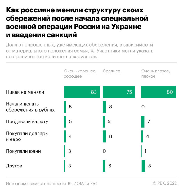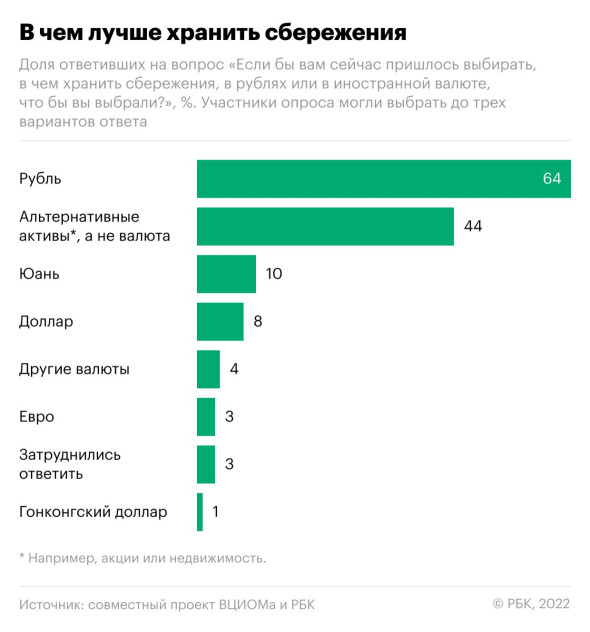 Выяснилось, что 64 % россиян хотят хранить суммы в рублях, 10 % — в юанях, 8 % — в долларах