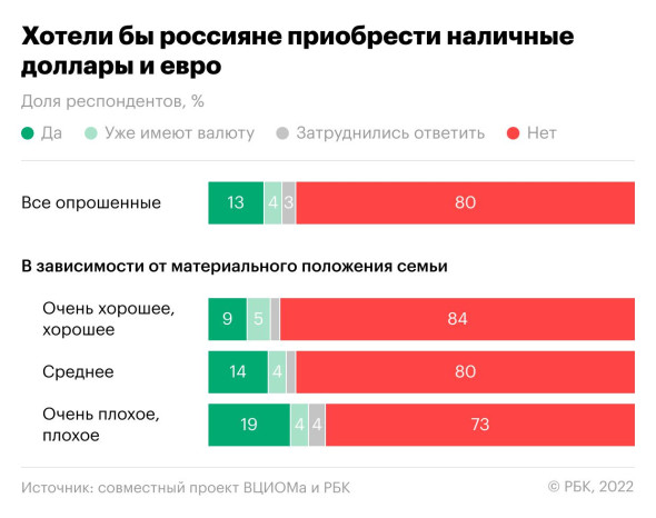 Чем хуже материальное положение респондентов, тем лучше они относятся к валюте: 19 %, которые оценивают своё состояние плохо и очень плохо, хотели бы её купить. А среди людей с хорошим достатком таких всего 9 %.