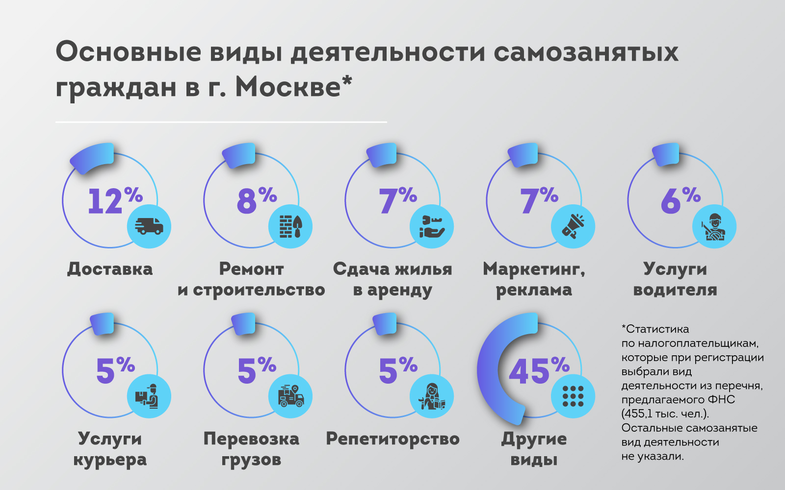 В московской ФНС проанализировали виды специализации 455,1 тыс. самозанятых — тех, кто при регистрации выбрали из предложенного списка определённые виды деятельности.