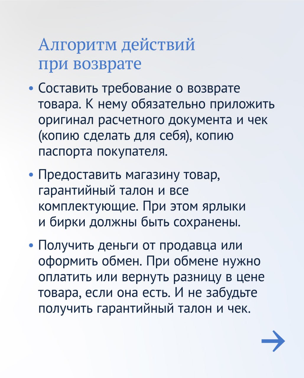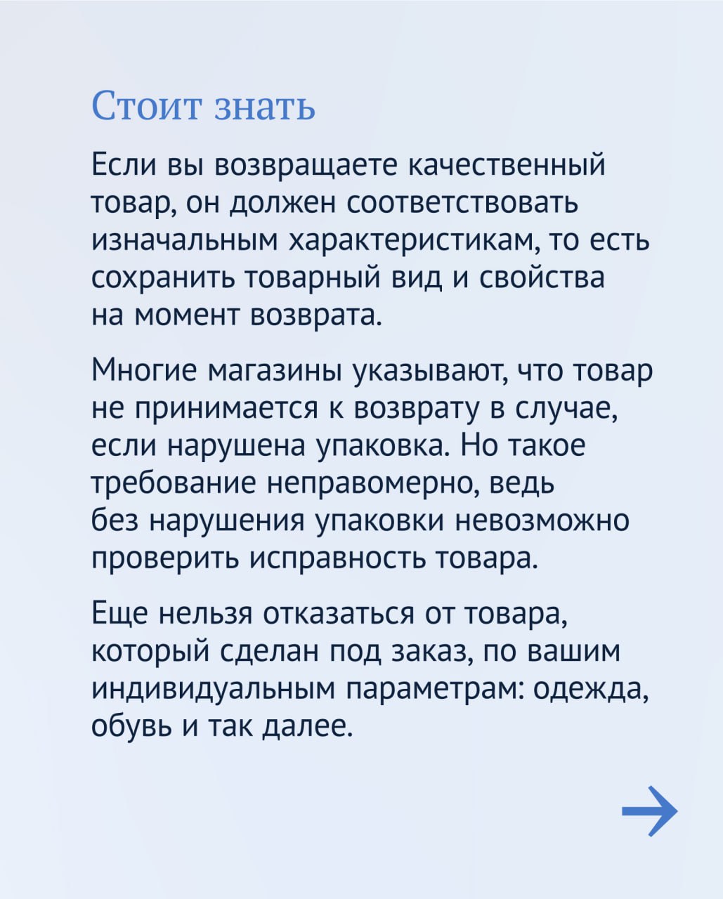 - вы имеете право вернуть качественный товар с нарушенной упаковкой, но в товарном виде и без повреждений.