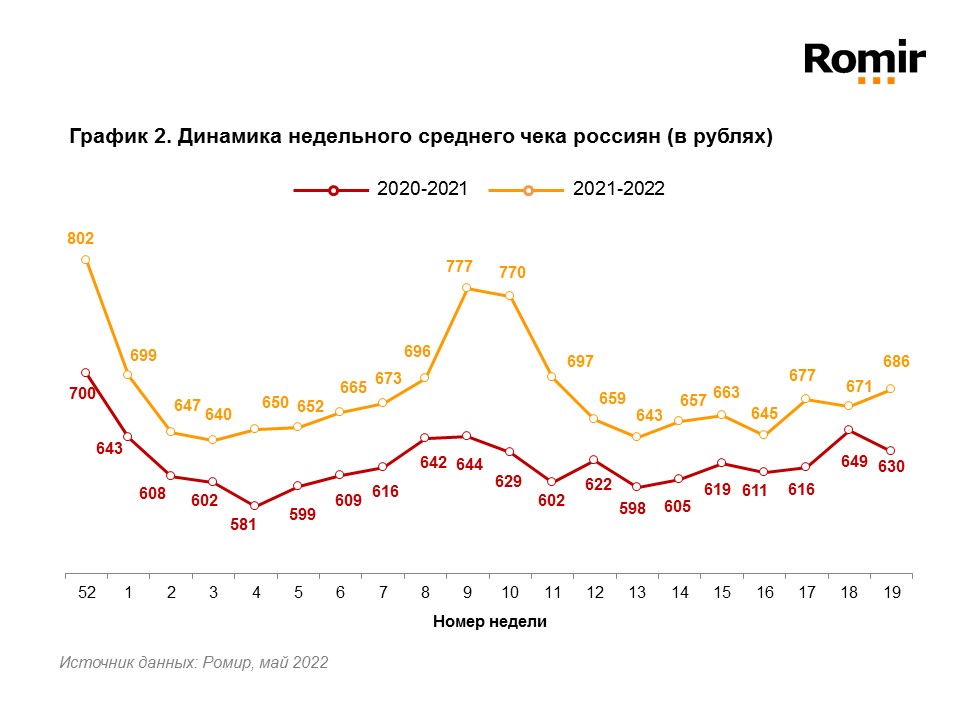 Индекс среднего чека по сравнению с предшествующей неделей увеличился на 2,2 %. Средняя стоимость одной покупки составила 686 рублей. По сравнению с аналогичным периодом прошлого года индекс показывает рост на 8,9 %. Относительно среднего значения за последние 12 месяцев (659 рублей) недельный чек выше на 4,1 %.