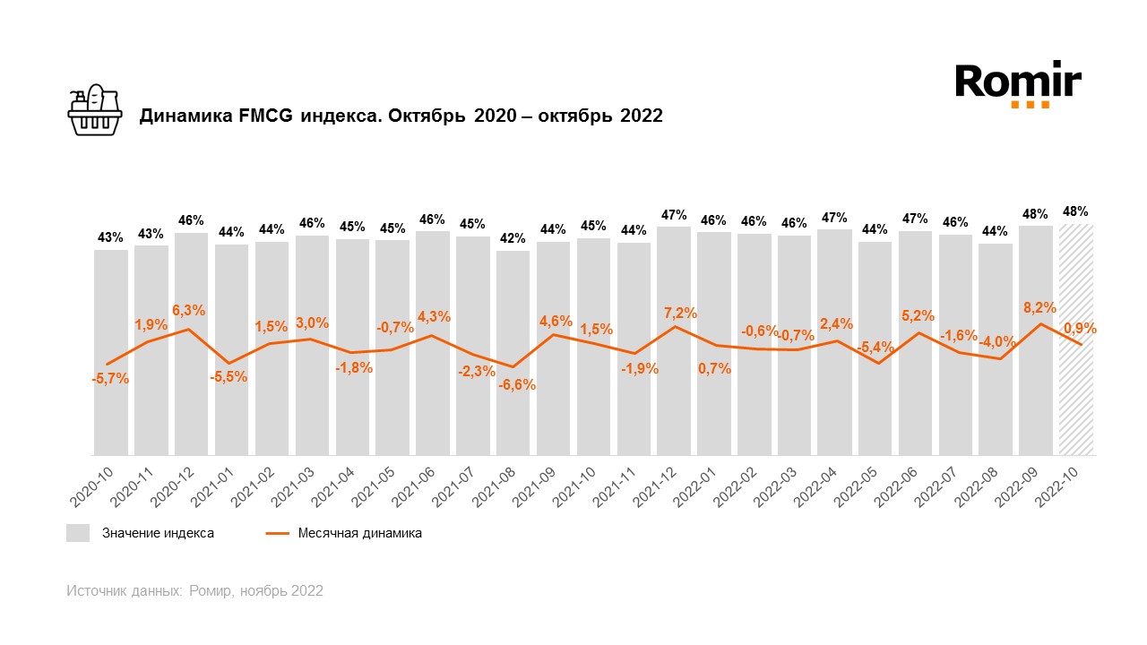«Ромир» регулярно рассчитывает ежемесячный FMCG Index — это показатель, демонстрирующий динамику доли затрат домохозяйств на продукты питания и непродуктовые категории товаров повседневного спроса в структуре всех затрат домохозяйства.