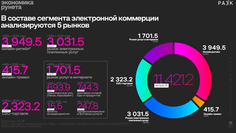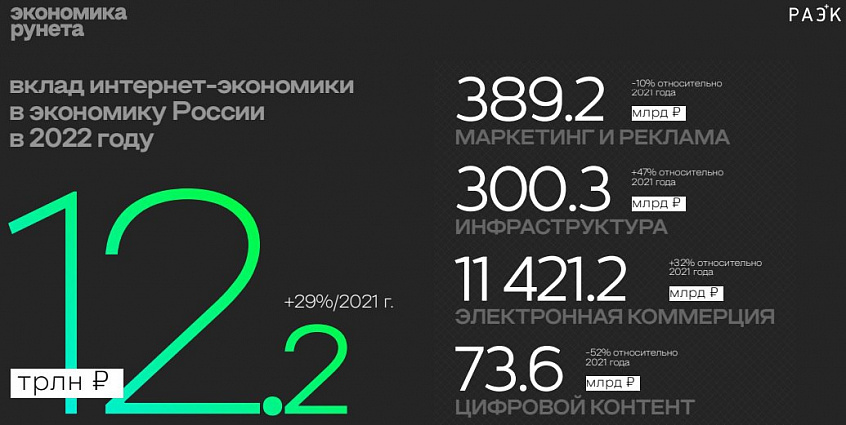 Сегмент электронной коммерции вырос на 32 % относительно 2021 года, до 11,4 млрд ₽. Объём интернет-рекламы и маркетинга в 2022 году составил 389,2 млрд ₽, что на 10 % меньше, чем в 2021 году. А вот рынок медиа и развлечений сократился на 52 %, составив 73,6 млрд ₽.