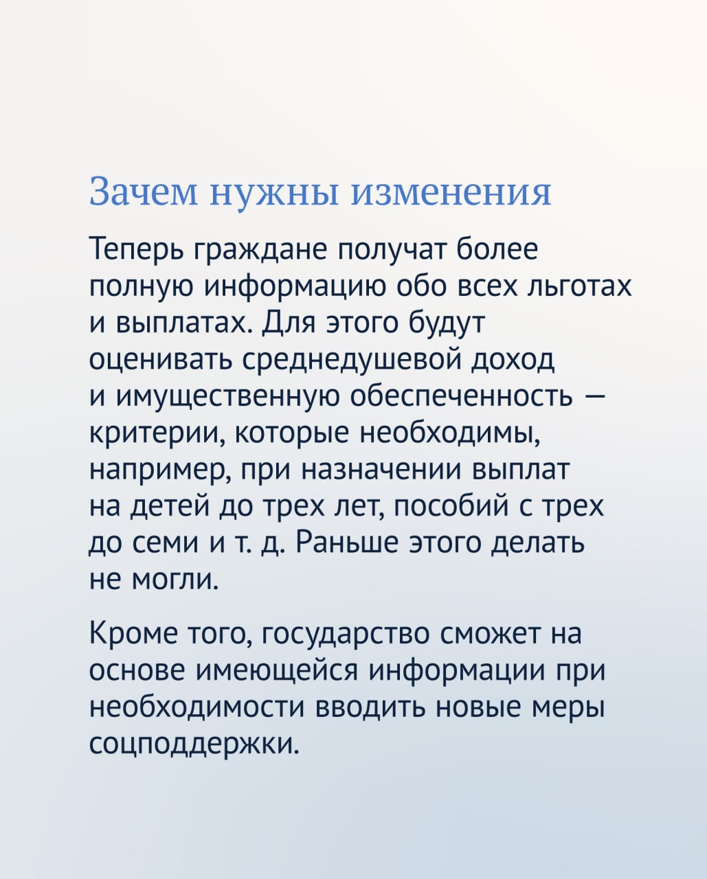 Теперь граждане получат более полную информацию обо всех льготах и выплатах. Для этого будут оценивать среднедушевой доход и имущественную обеспеченность — критерии, которые необходимы, например, при назначении выплат на детей до трех лет, пособий с трех до семи и так далее. Раньше этого делать не могли.
