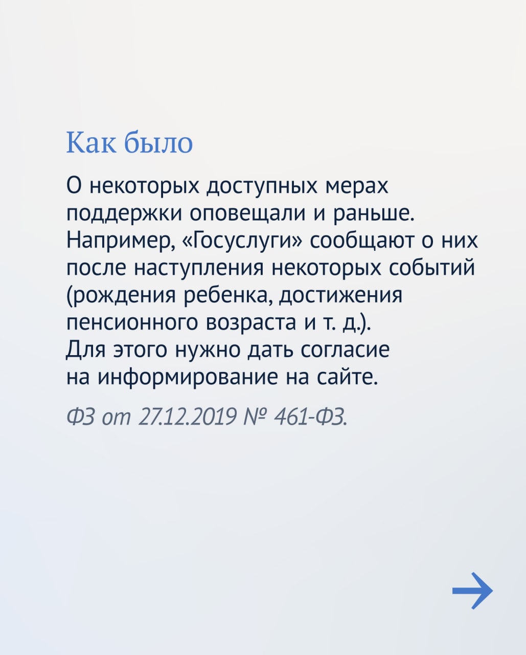 О некоторых доступных мерах поддержки оповещали и раньше. Например, «Госуслуги» сообщают о них после наступления некоторых событий: рождения ребёнка, достижения пенсионного возраста и так далее. Для этого нужно дать согласие на информирование на сайте.